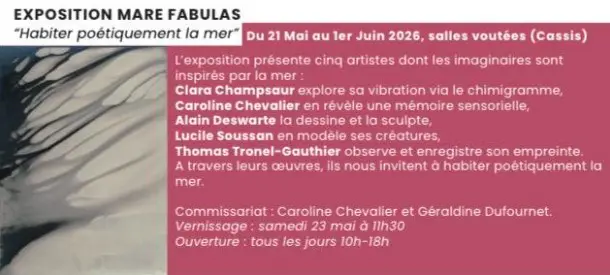 Vom 21. Mai bis zum 1. Juni 2026 wird die Ausstellung "Mare Fabulas" in der einzigartigen Umgebung der Salles Voûtées auf dem Place Baragnon im Herzen des Dorfes Cassis gezeigt.