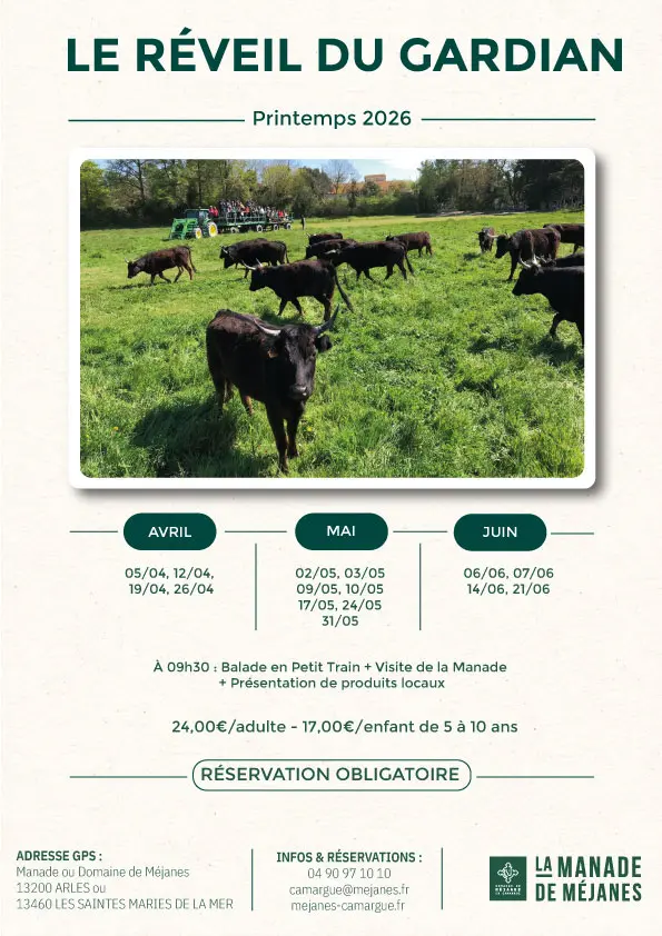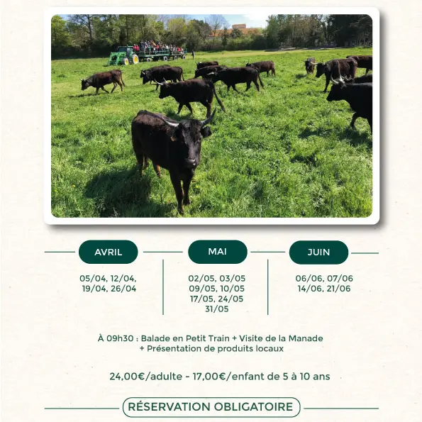 Auf dem Programm steht eine Fahrt mit dem Petit Train de Méjanes , dann ein Besuch der Manade im Schleppanhänger. Zum Abschluss können Sie an der Präsentation der regionalen Produkte am Kiosk gegenüber der Arena teilnehmen.