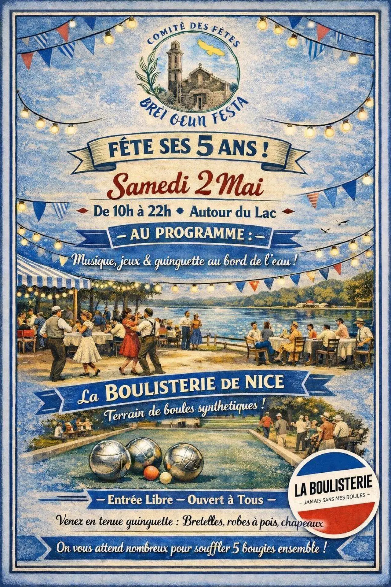 Feiern Sie den 5. Geburtstag des Festkomitees im Tour du Lac! Guinguette-Atmosphäre am Ufer des Sees den ganzen Tag über. Profitieren Sie von der Boulisterie de Nice mit ihren synthetischen Bouleplätzen. Der Eintritt ist frei. Für alle geöffnet.