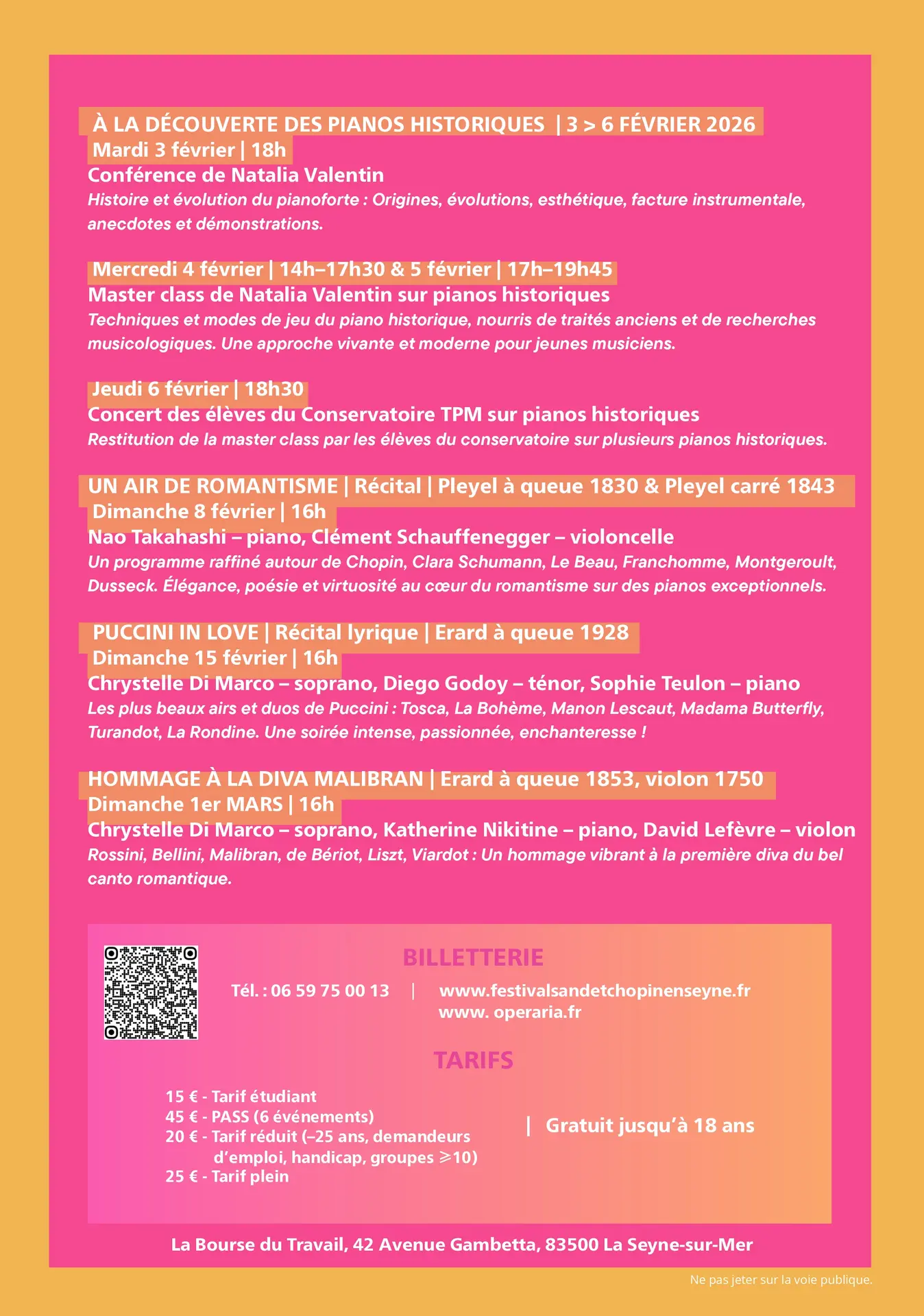 Reservierungen sind auch am Abend des Konzerts vor Ort möglich (Bezahlung in bar, per Scheck, ausgestellt auf: Association Opéraria, Kreditkarte).