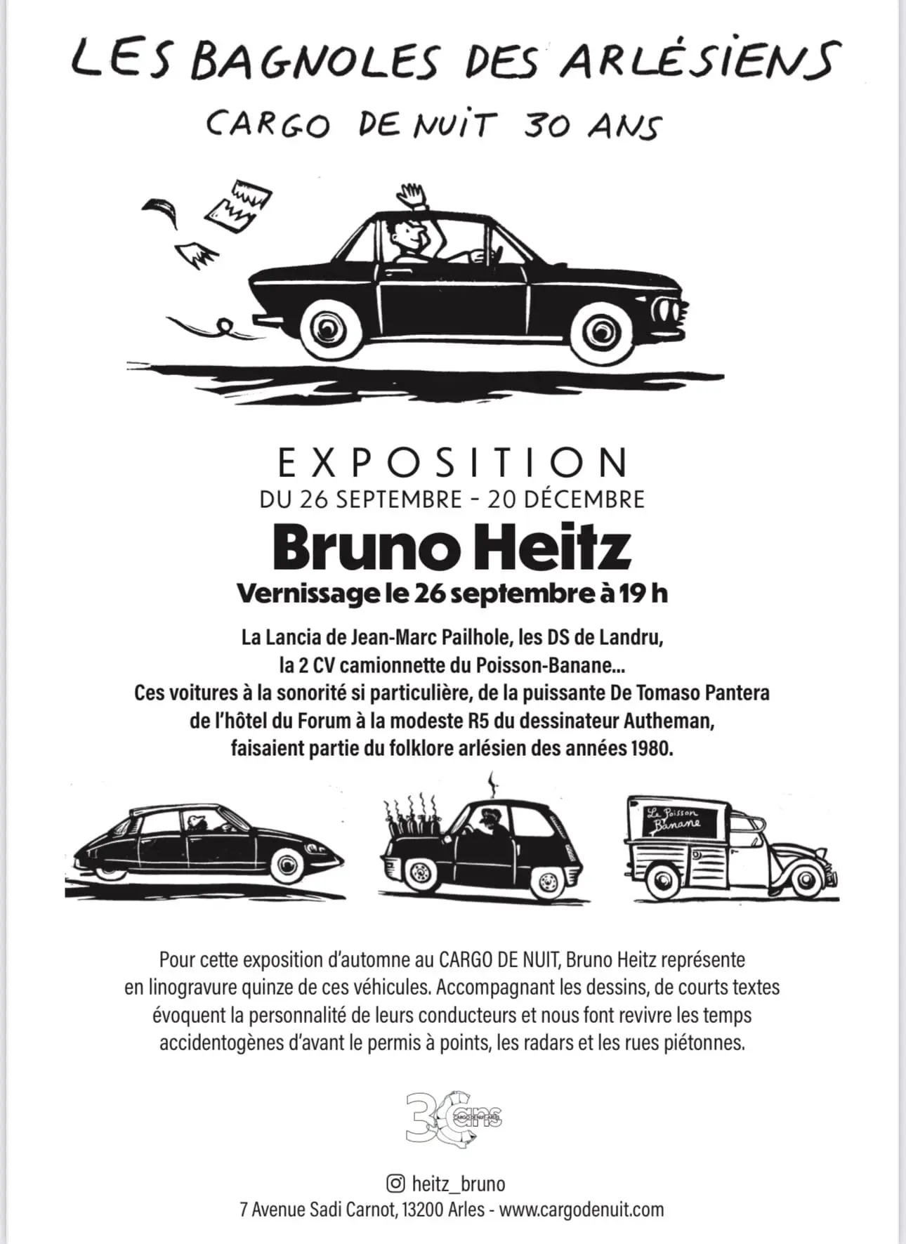 Für diese Herbstausstellung im CARGO DE NUIT stellt Bruno Heitz fünfzehn dieser Fahrzeuge im Linolschnitt dar. Begleitet werden die Zeichnungen von kurzen Texten, die die Persönlichkeit der Fahrer beschreiben und uns die unfallträchtigen Zeiten vor dem Punkteführerschein, den Radarfallen und den Fußgängerzonen wieder lebendig werden lassen.