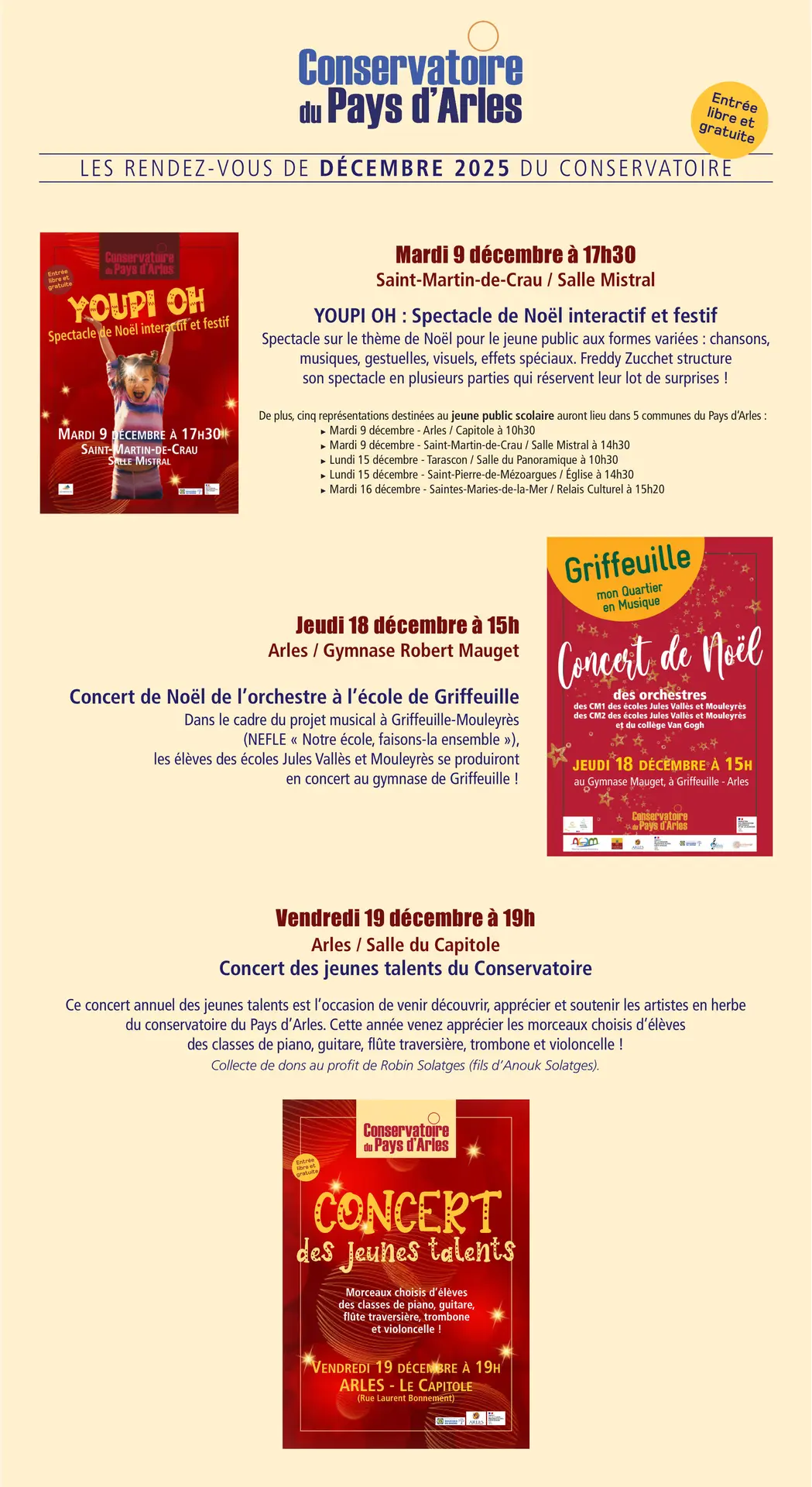 Das Conservatoire de Musique du Pays d'Arles hat seit seiner Gründung im Jahr 1986 zahlreiche Projekte in den Bereichen Musikunterricht, -erziehung und -vermittlung entwickelt. Für den Monat Dezember erwartet Sie ein reichhaltiges Konzertprogramm.