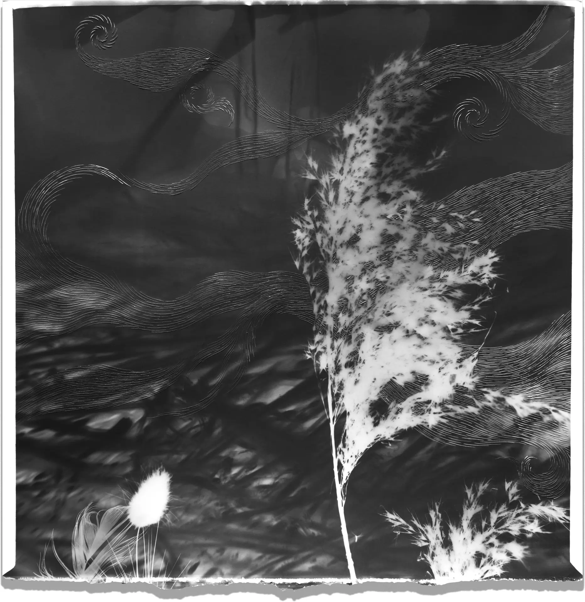 Mistral Amazonas inszeniert das fiktive Zusammentreffen zweier Energieströme: den Mistral und den Amazonas. Zeichnungen, Gravuren, Rayogramme und Lumenprints übersetzen diese Energien in sensible und poetische Formen.
