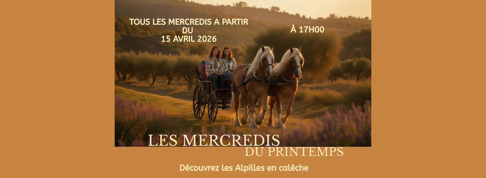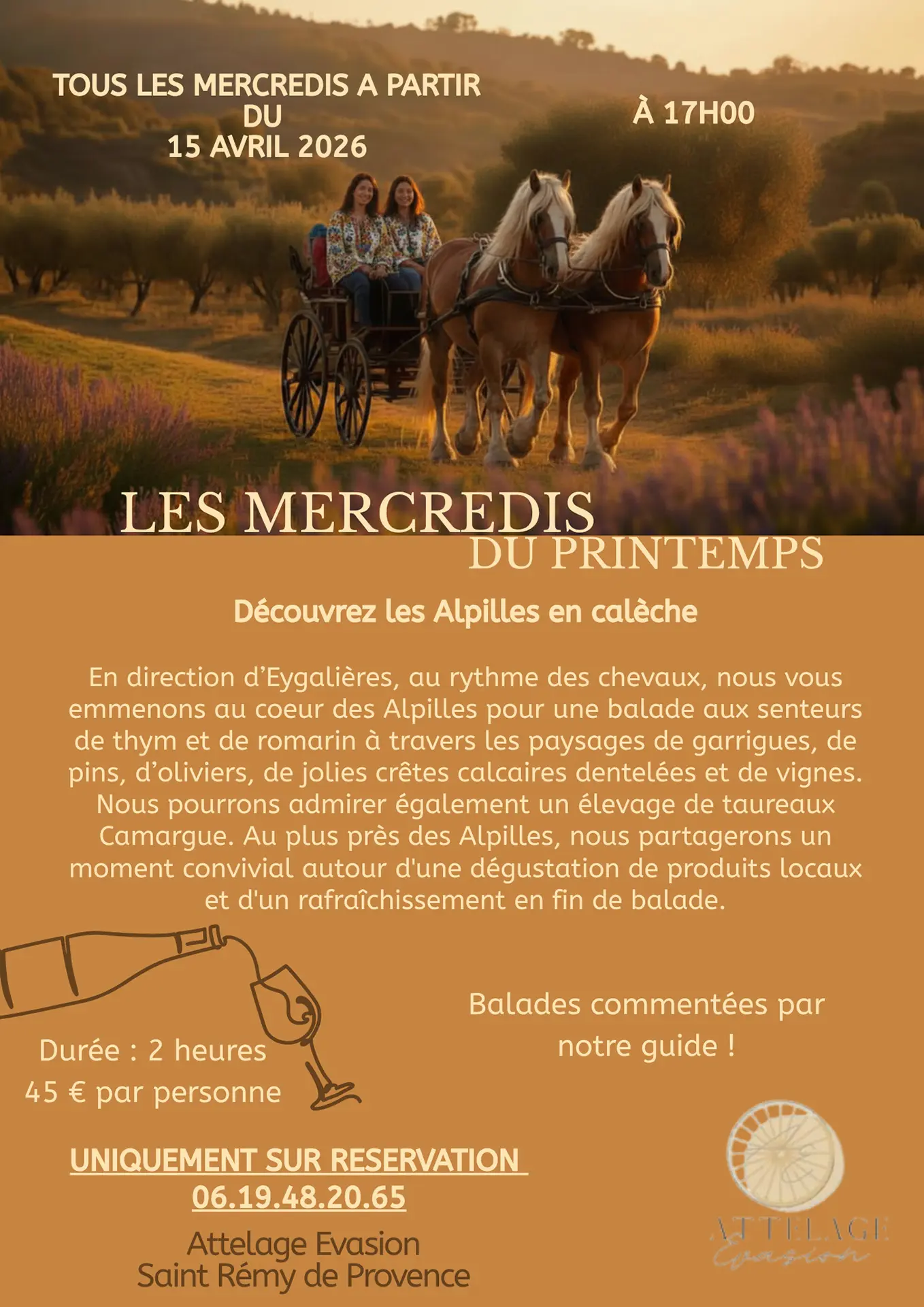 Attelage Évasion lädt Sie zu den „Frühlingsmittwochs“ ein, um die Alpilles mit der Kutsche zu entdecken.