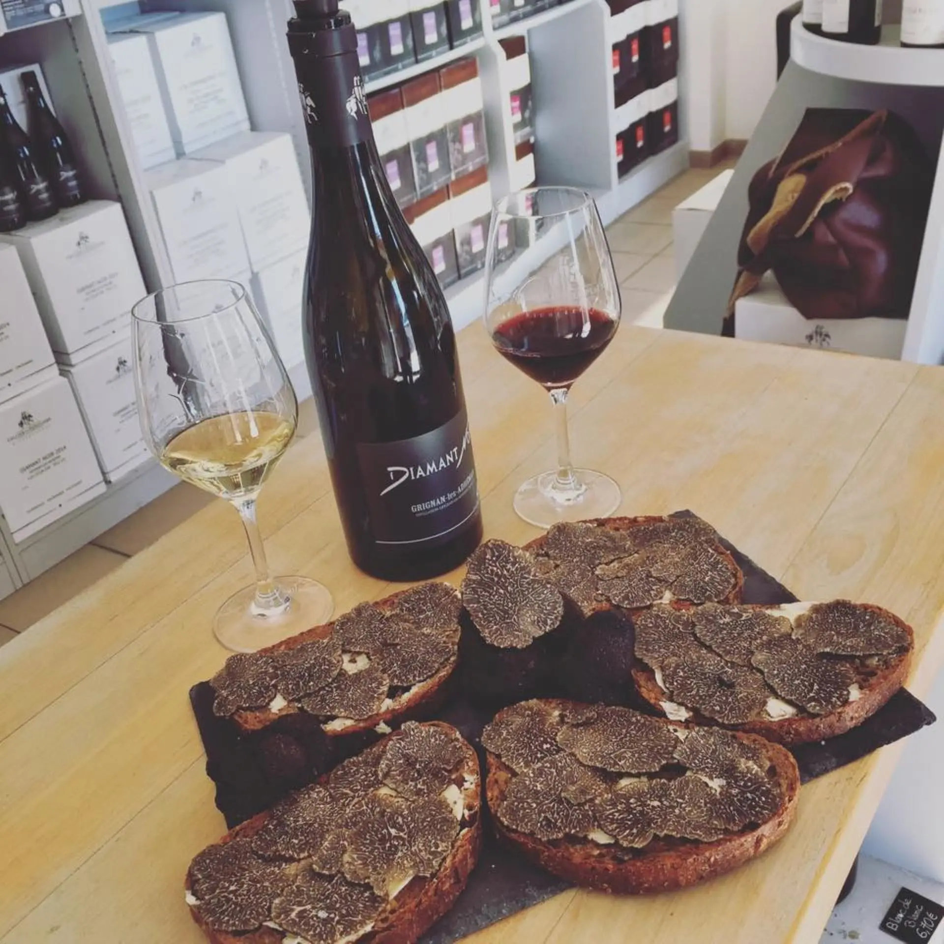 Wenn Trüffel und Wein aufeinandertreffen… Verkostung von Trüffeltoast, hauchdünne Scheiben marktfrischer Trüffel, vor Ort geschnitten, auf eine Scheibe ausgewähltes Brot gelegt, mit Butter und einem Hauch Fleur de Sel.
