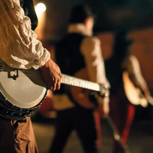 Musiker sitzen am Tisch, essen und trinken und teilen ihre keltische Leidenschaft mit der Musik.