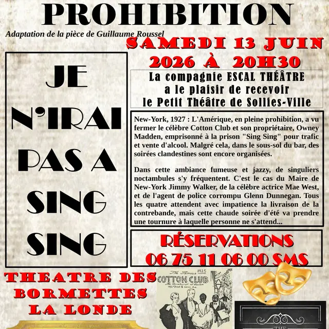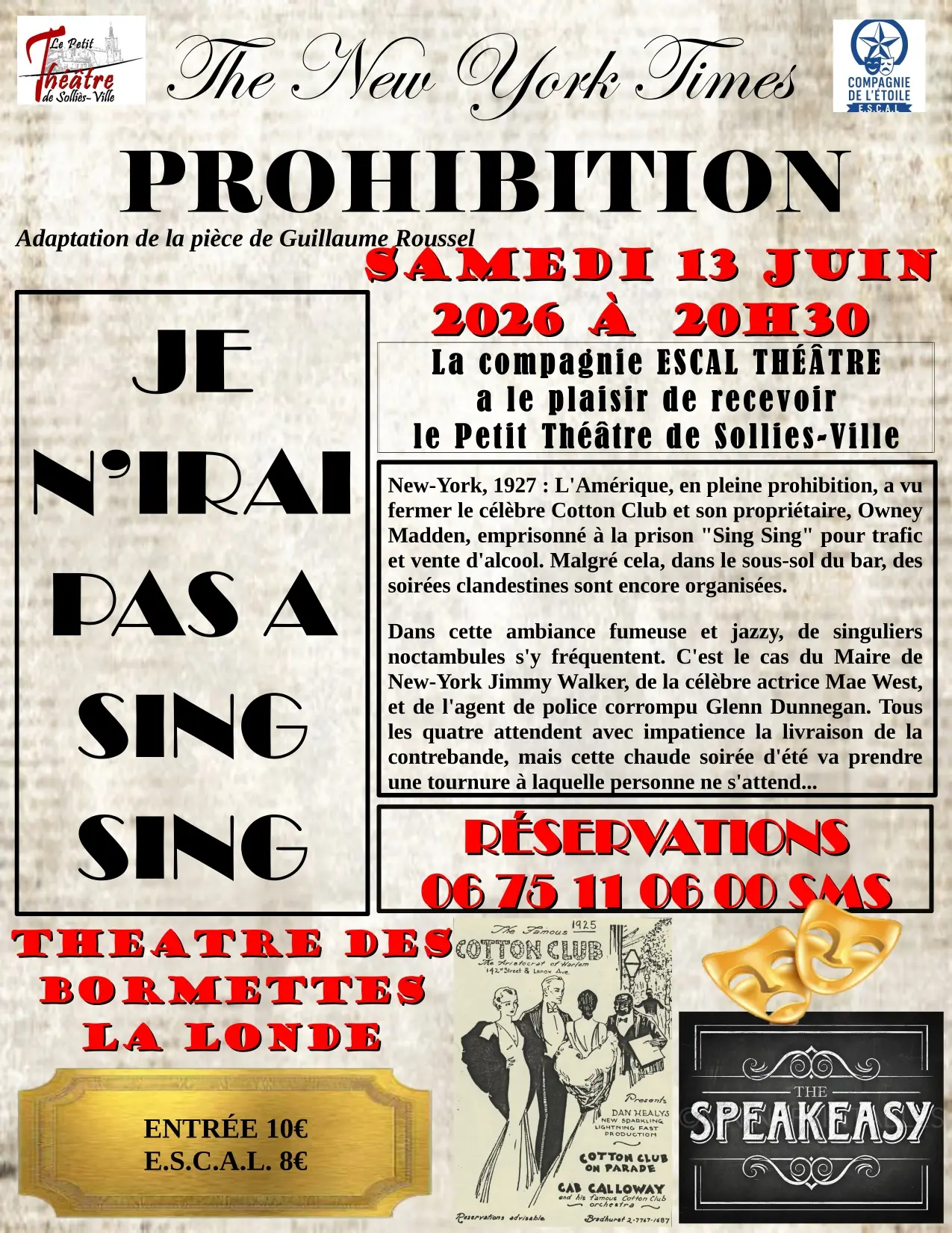 Organisiert von der Compagnie de l'Etoile ESCAL. Das Stück "Je n'irai pas à Sing Sing" wird im Theater des Bormettes aufgeführt, das von Guillaume Roussel aus dem Stück des kleinen Theaters von Solliès-Ville adaptiert wurde.
