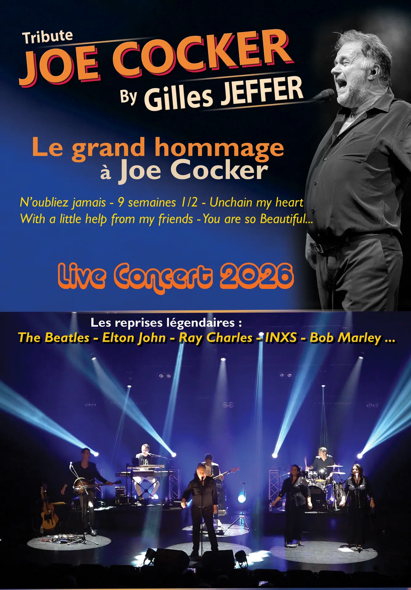Eine professionelle, authentische Show, die dem musikalischen Werk des großen Künstlers treu bleibt, getragen von der rockigen Stimme und der einzigartigen Bühnenpräsenz von Gilles Jeffer.