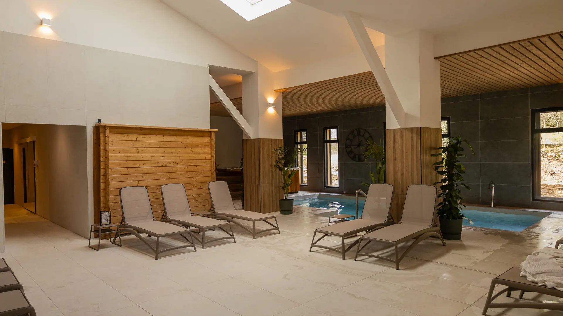 Entspannungsbecken : Ein Innen- oder Außenbecken, das so gestaltet ist, dass Sie in aller Ruhe schweben können. Das erwärmte Wasser und die Hydromassagedüsen sorgen für eine vollständige Muskelentspannung, perfekt nach einem aktiven Tag oder einfach nur zum Abschalten.