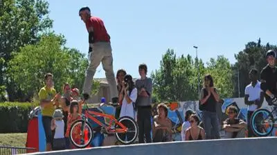 Auf der Struktur eines auf dem Gelände vorhandenen Tanks wurde ein Streetball-Feld angelegt. Eine 2,50 m hohe Mauer teilt den Skatepark vom Stadion ab und kann für grafische Gestaltungen benutzt werden. Im Eingangsbereich der Anlage wurden ein Gebäude mit Sanitäranlagen und Vereinsräumen geschaffen. Um die Nutzfläche zu verdoppeln, ist das Dach dieses Gebäudes für die Öffentlichkeit mittels einer bepflanzten Rampe zugänglich. Von diesem Aussichtspunkt aus, an dem sich die Richter bei den Wettkämpfen aufhalten, ist der Blick über den Skatepark optimal.