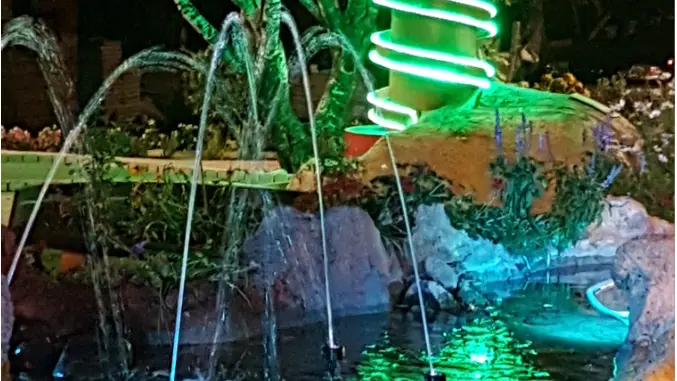 Ein wunderbarer Garten mit unzähligen Blumen, geschmückt mit Wasserfällen, Teichen, Felsbrunnen und Tiersujets aus der Tierwelt der umliegenden Berge.