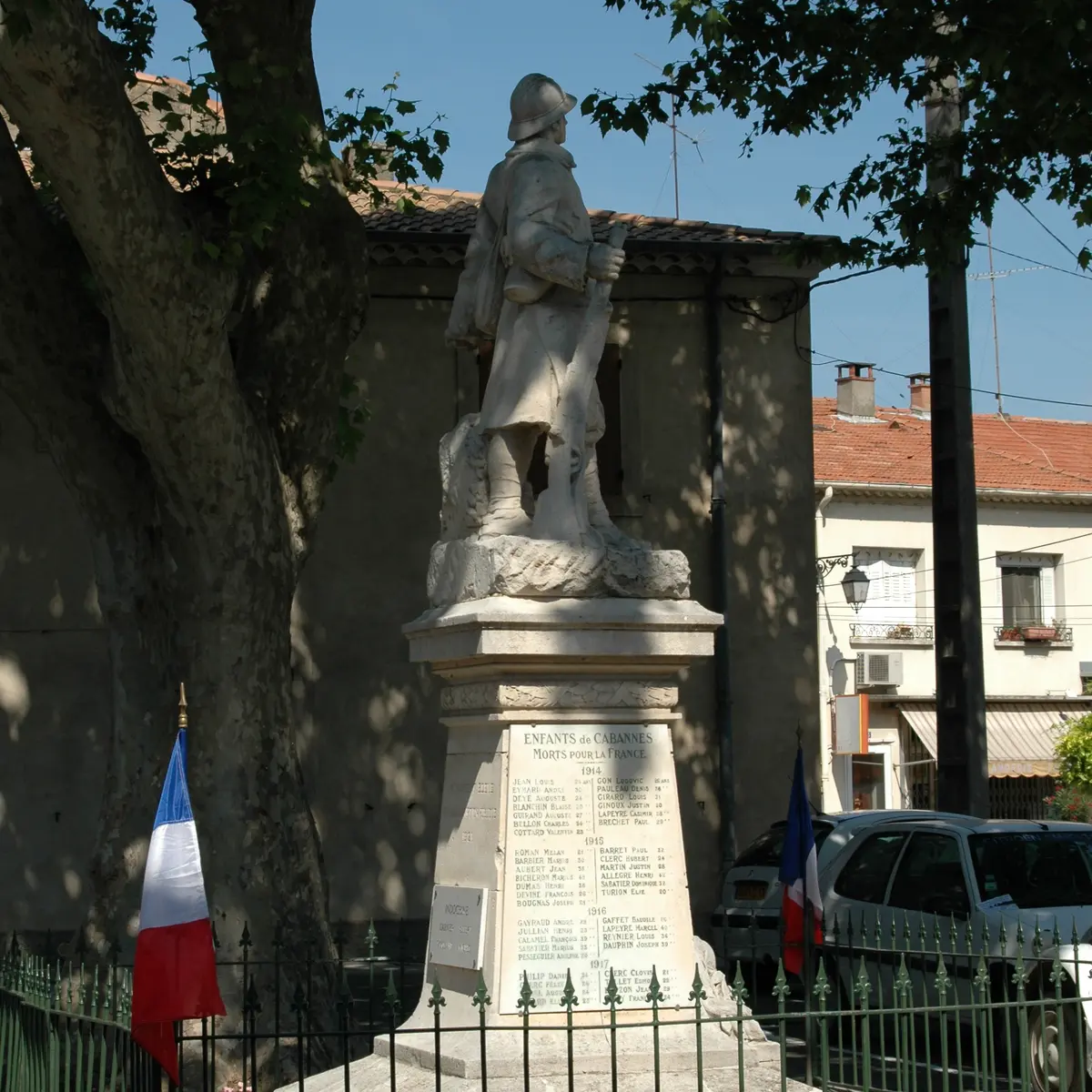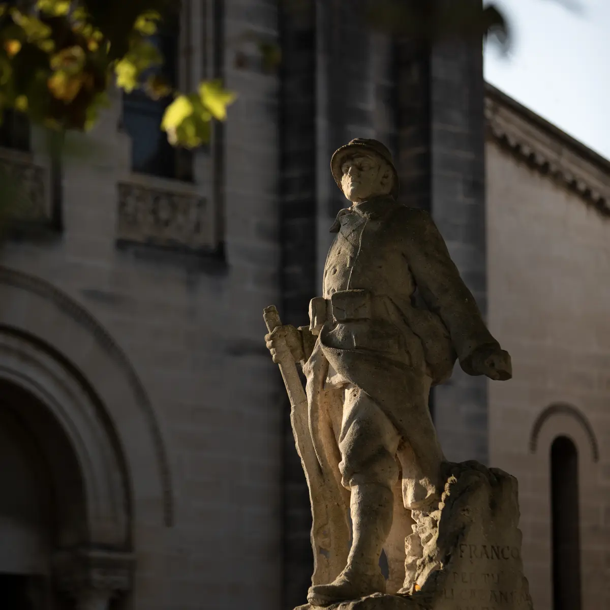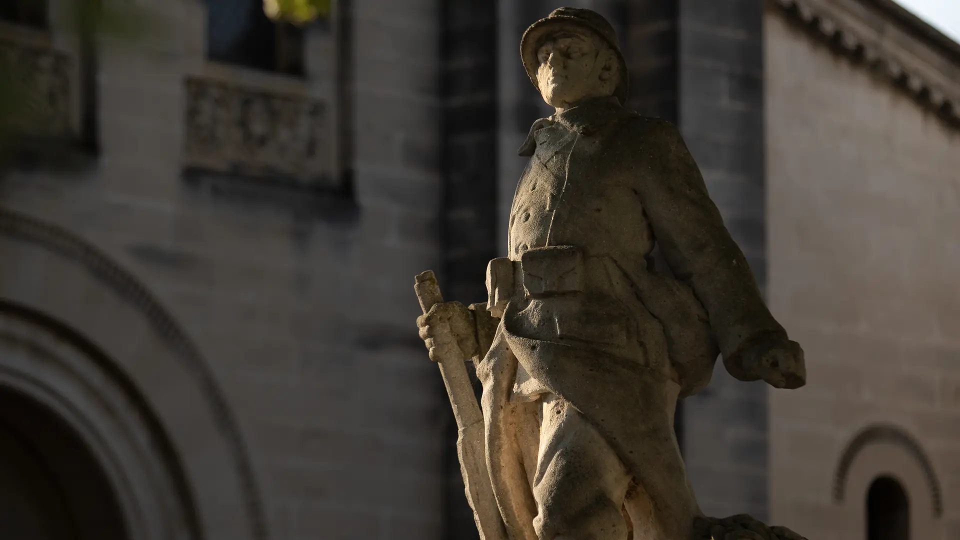 Statue eines Soldaten aus dem Ersten Weltkrieg auf einem hohen Piedestal mit Gedenktafel. Wurde 2010 unter Denkmalschutz gestellt.