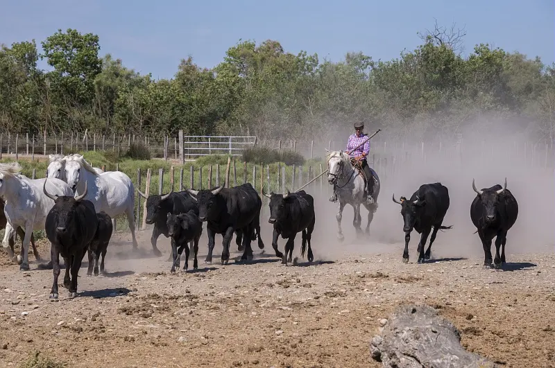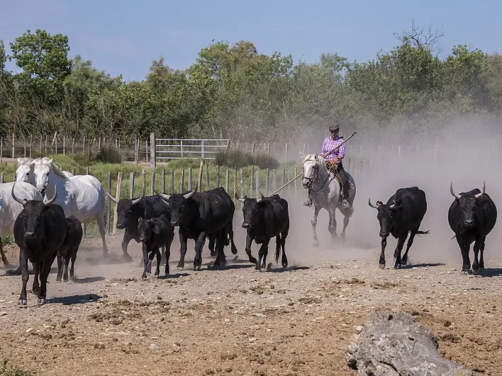 Entlang der kleinen, ruhigen Weiler enthüllt die Ebene den Getreideanbau und die Weiden der Camargue-Stiere. Noch erstaunlicher ist es, die letzten Weinbaubetriebe der Camargue und ihre großen Weingüter vor dem Hintergrund der Alpilles-Kette zu entdecken.