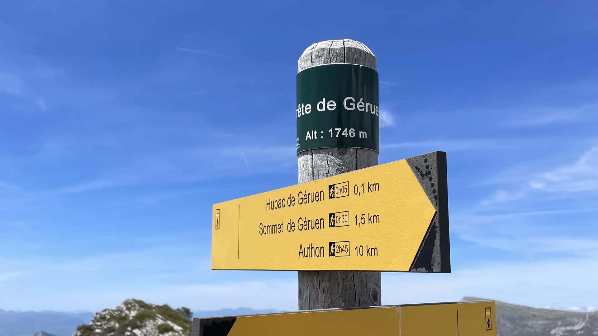 Vom Col de Fontbelle (1304 m) – Folgen Sie dem Waldweg, der nach Norden führt, am Forsthaus Fontbelle vorbei und 750 m weiter. Dann biegen Sie rechts ab auf den Weg, der durch den Wald ansteigt und an einer Kreuzung endet. Gehen Sie nach links, der Weg kreuzt sich weiter, immer noch im Wald, und verläuft dann an der Felsbank entlang, bevor Sie diese überqueren und den Bergrücken erreichen. Am gegenüberliegenden Hang 150 m weitergehen. Steigen Sie dann vom Weg ab (achten Sie dabei genau auf die Markierungen) und erreichen Sie den Kamm von Géruen. Folgen Sie ihm links bis zum Gipfel des Géruen. Die Rückreise erfolgt über die Strecke der Hinfahrt.