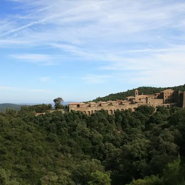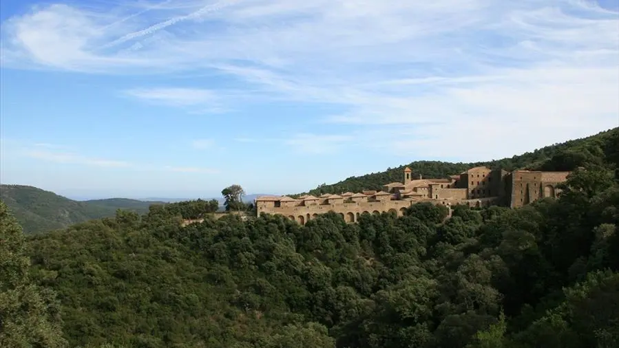 Nach Verlassen des Parkplatzes, an dem sich eine Informationstafel über das integrale biologische Reservat der Mauren befindet, gehen Sie links in Richtung Chartreuse de la Verne und folgen dem Pfad. Sie können einen Panoramablick auf die Chartreuse beobachten, die Sie nach etwa 700 m über eine Piste erreichen.