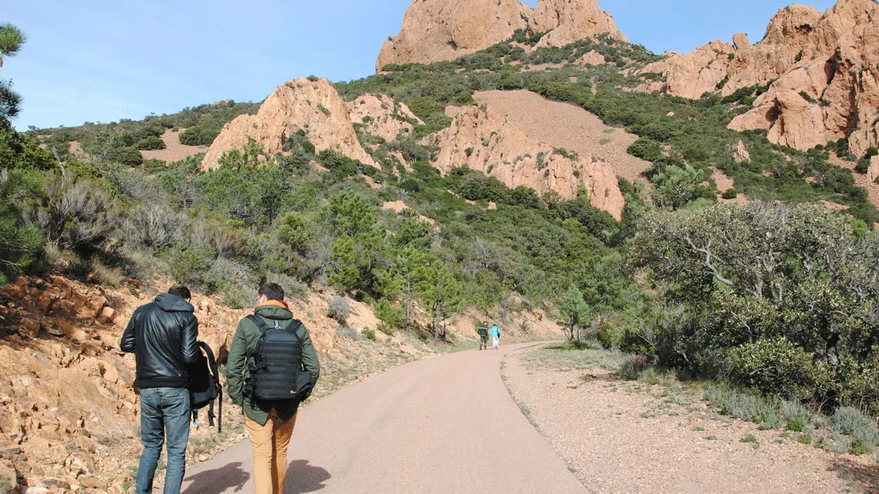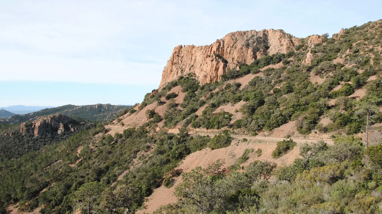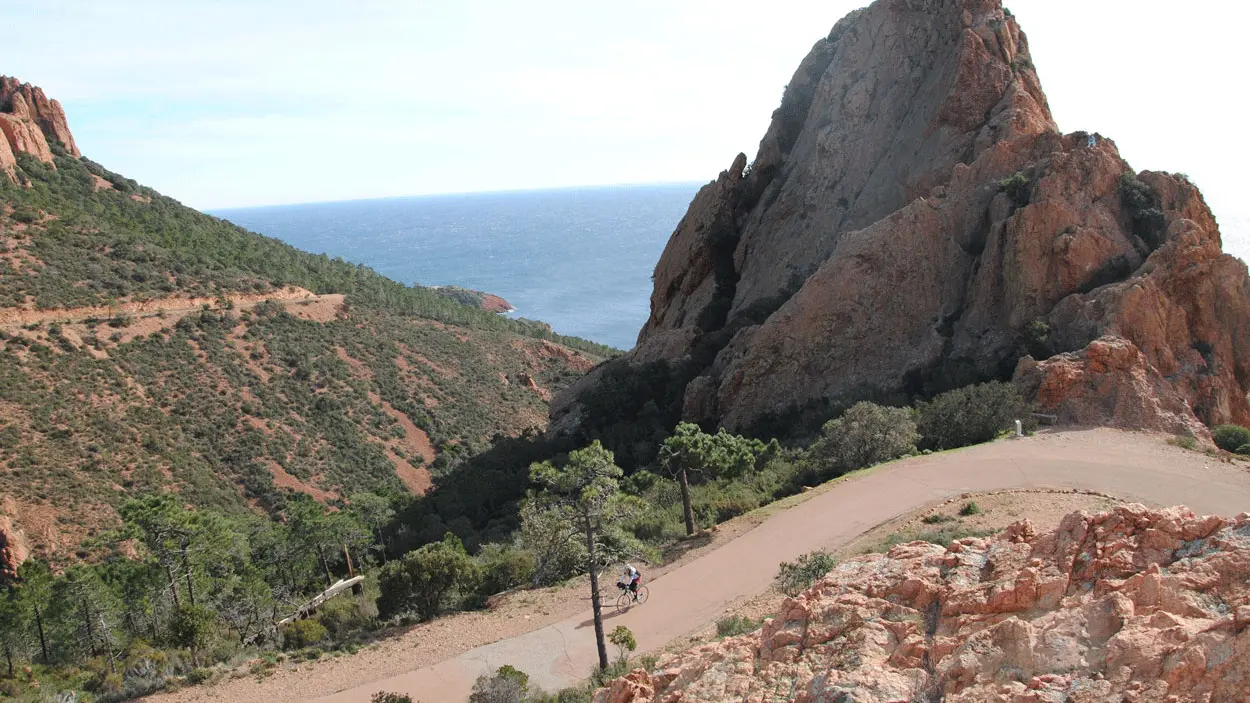 Vom Rocher Saint-Barthélémy aus haben Sie den Kontrast zwischen dem blauen Himmel der Côte d'Azur und den roten Felsen des Estérel-Massivs bestens im Blick. Barrierefreie Wanderung.