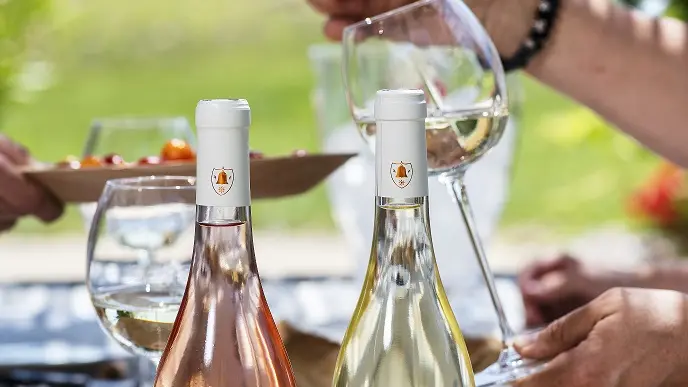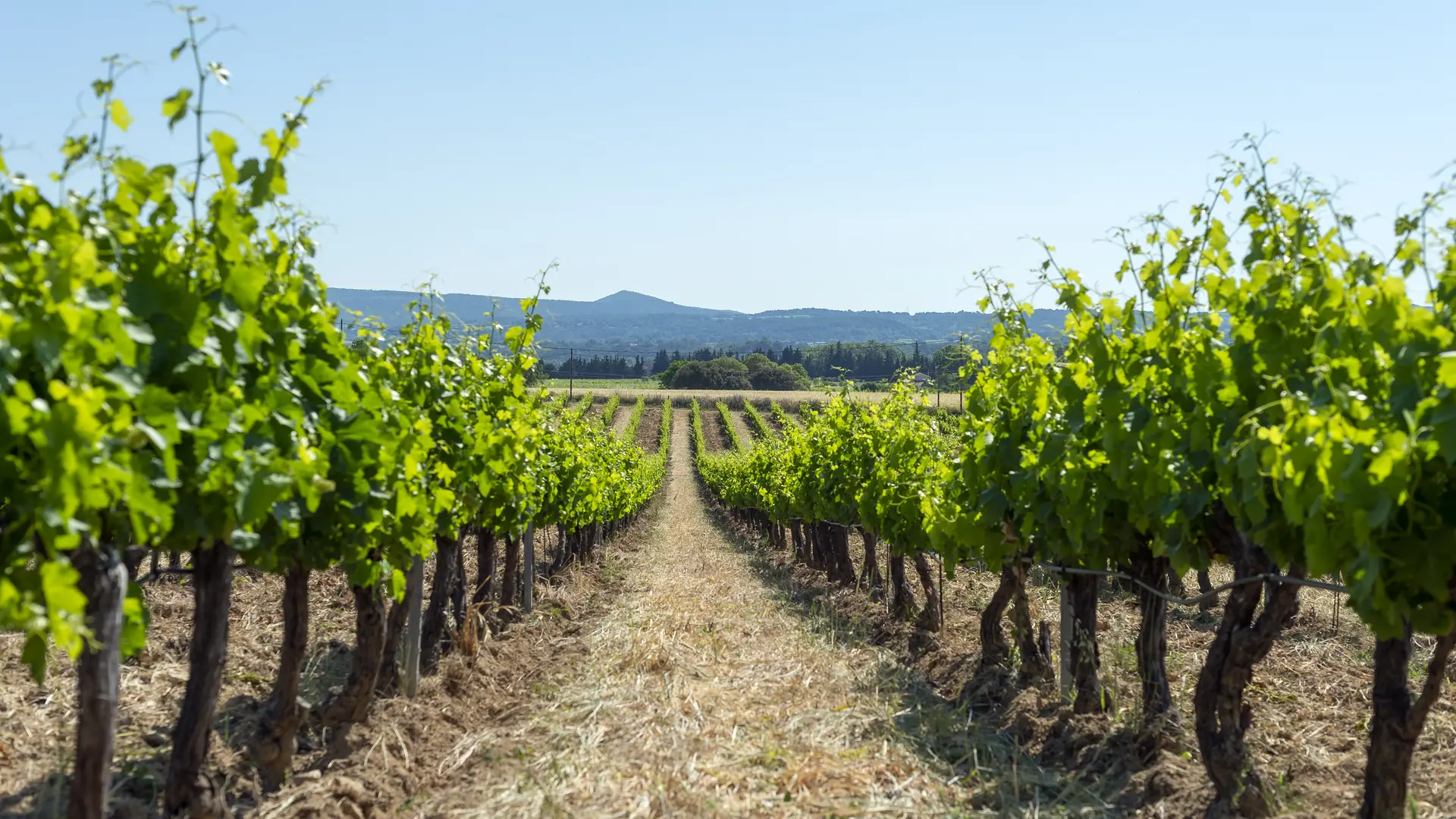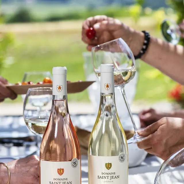 Dégustation de vin rosé en terrasse, sous le soleil de Provence, avec vue sur la campagne environnante.