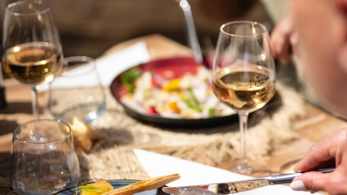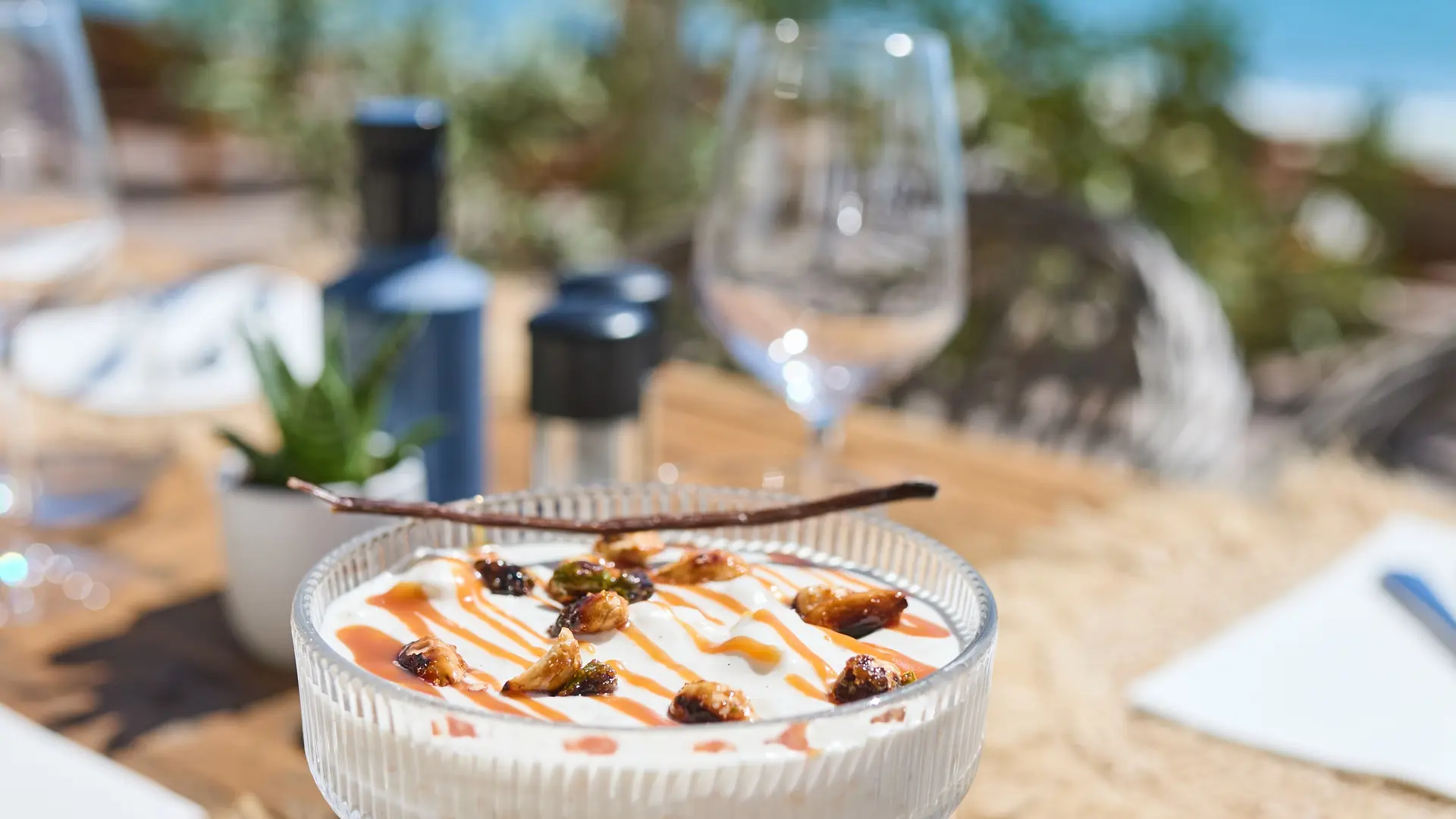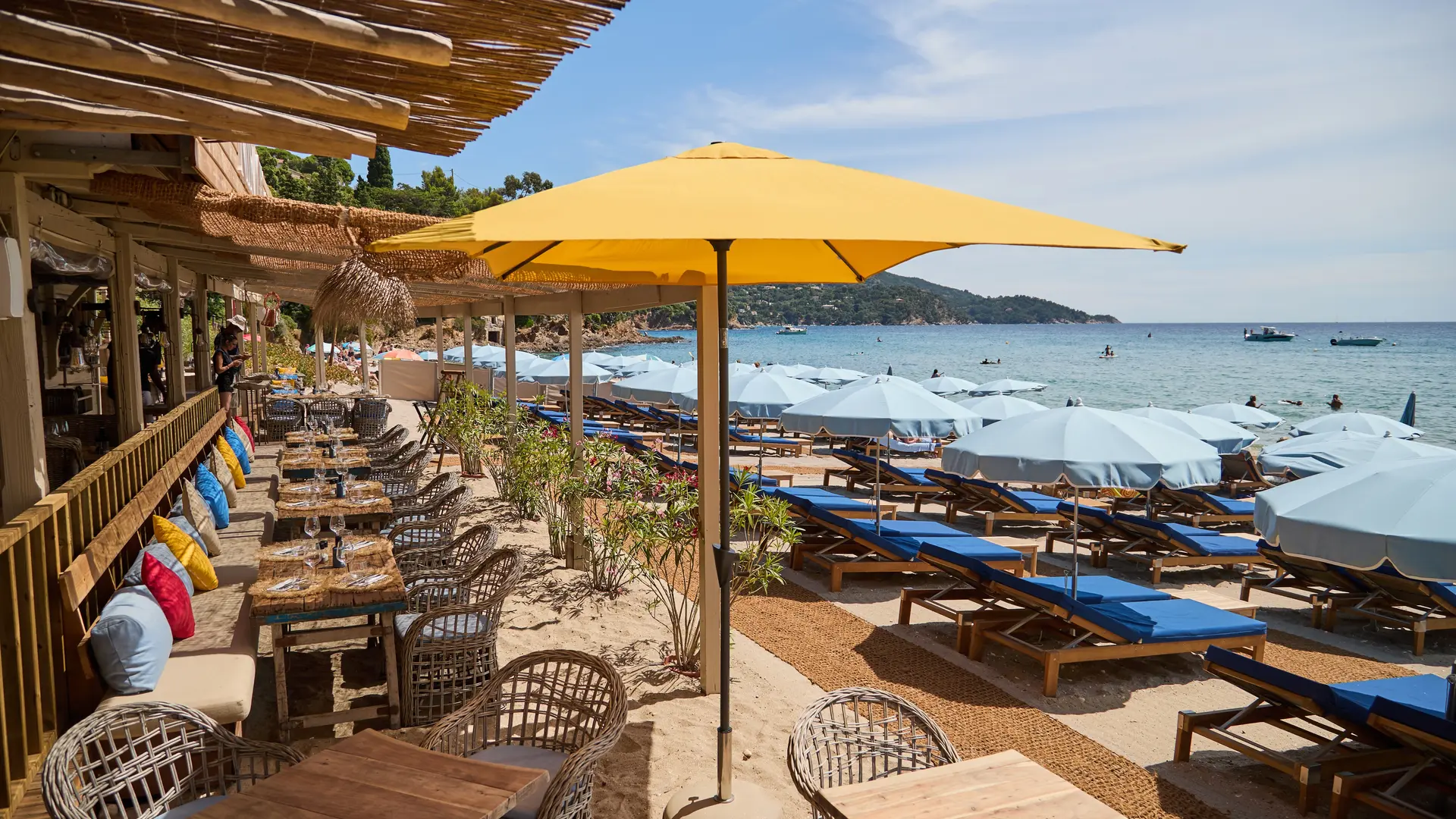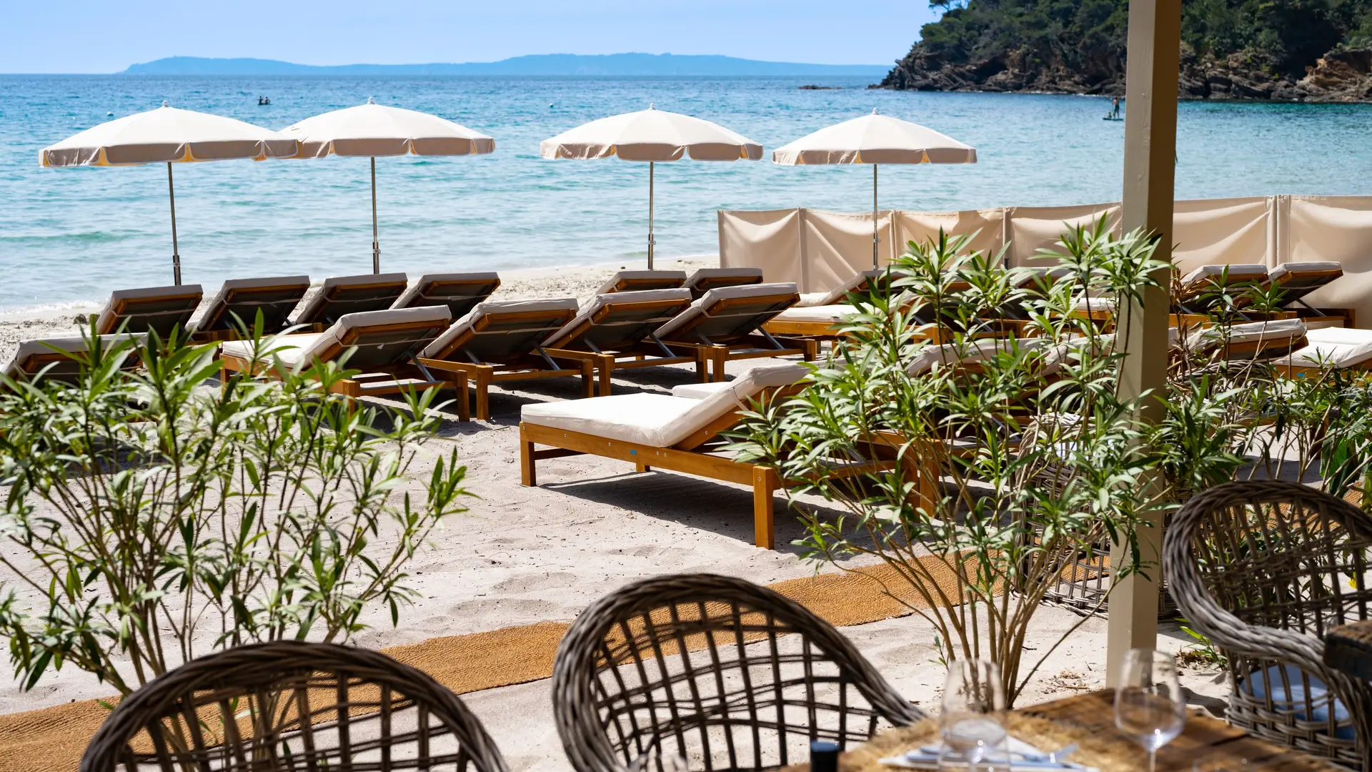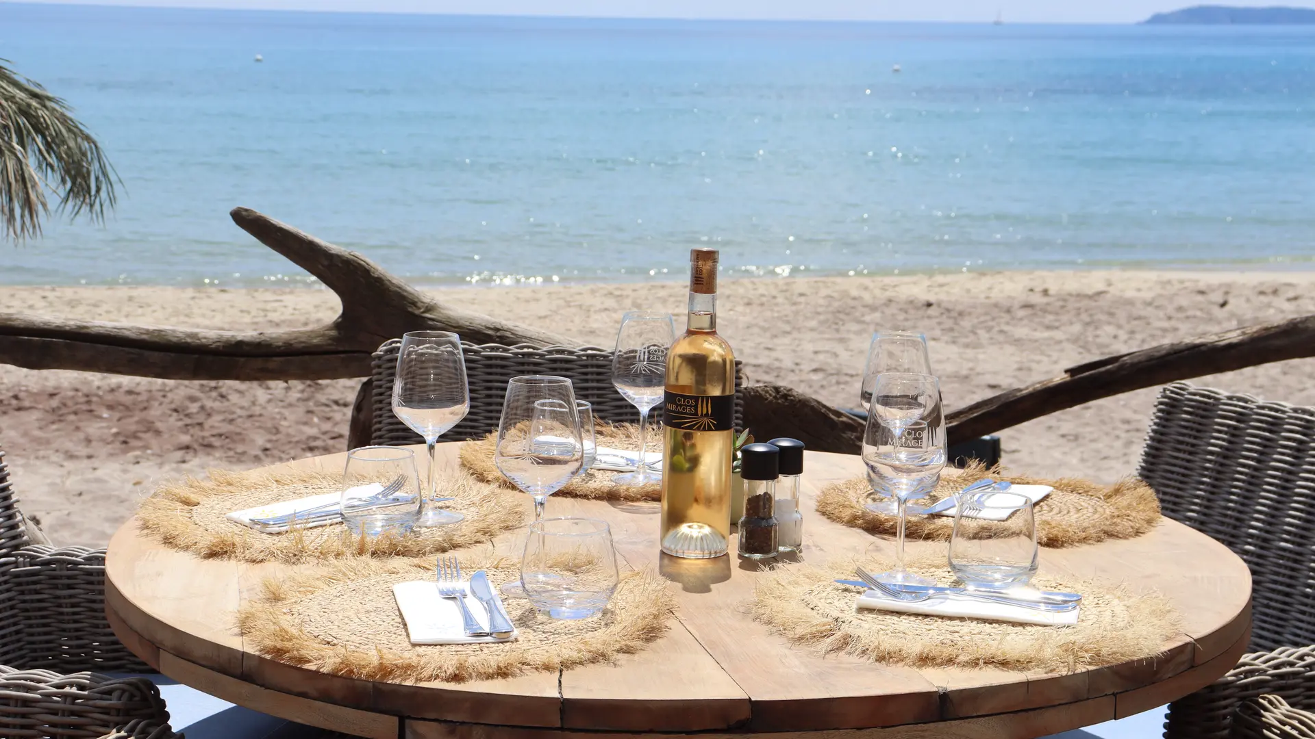 Am Strand von Pramousquier, gegenüber den Îles d'or, empfängt Sie MIRAGES à la plage zum Mittag- oder Abendessen. Am Tisch und auf unseren Liegestühlen entdecken Sie eine saisonale mediterrane Küche, die von den Weinen der Domaine Clos Mirages begleitet wird.