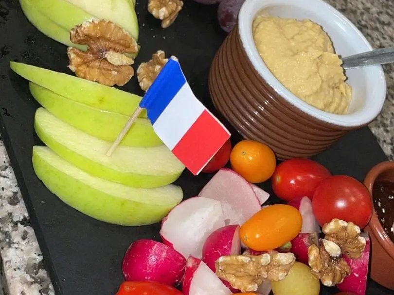 Vegetarische Verpflegung: Hummus, Brunnenkresse, Gemüse und Obst der Saison, Feigenmarmelade.
