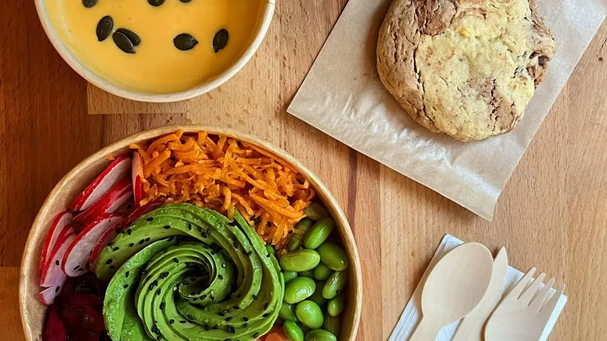 - Poké vegetarisch: Avocado, Gurke, eingelegte Karotte, Mango, eingelegter Rotkohl, Rettich, Edamame, Cebette, Sesam.