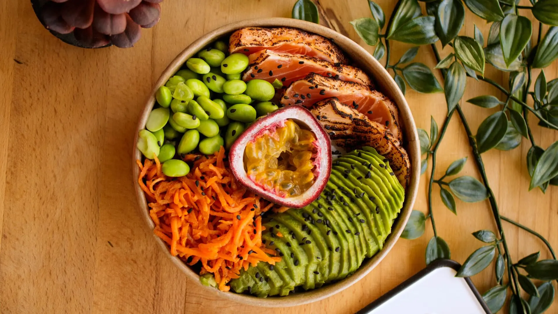 - Poké Huhn: Niedrigtemperatur gegartes Huhn mariniert, Zucchini, Avocado, marinierter Rotkohl, Cashewnüsse, Sesam.