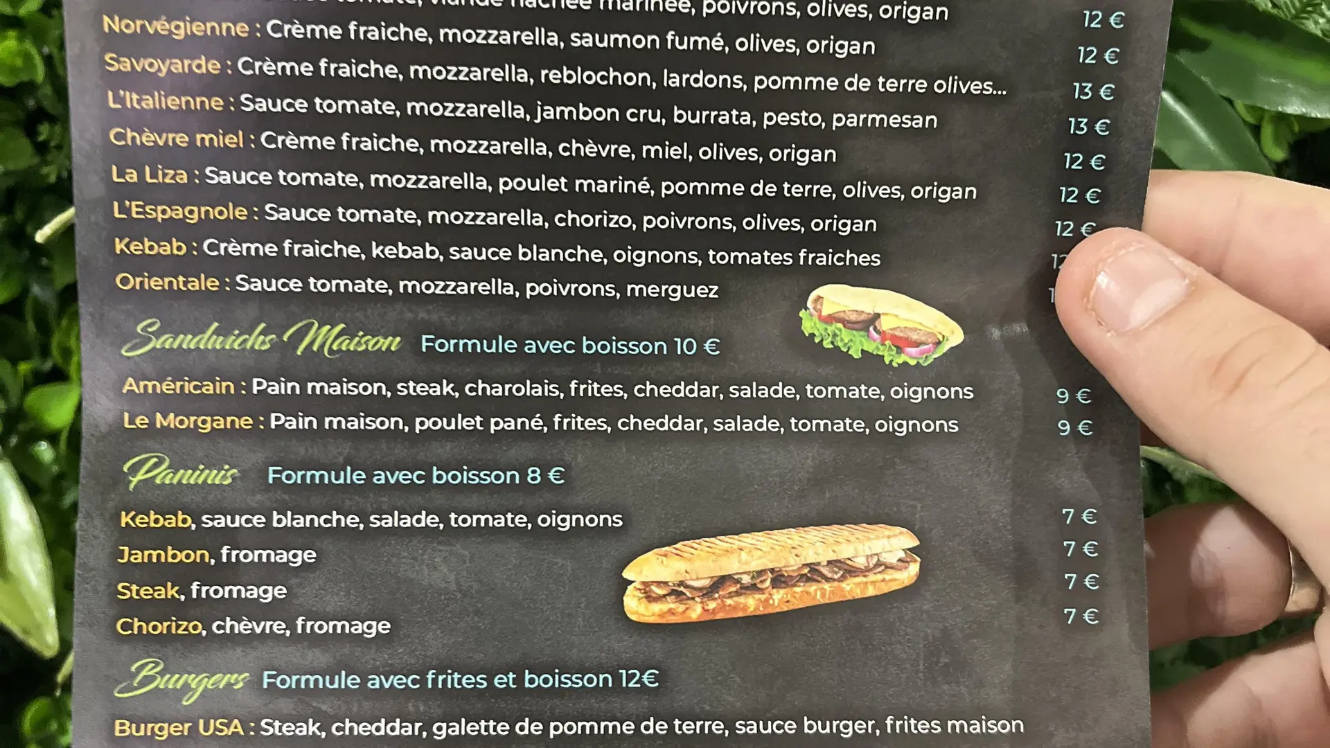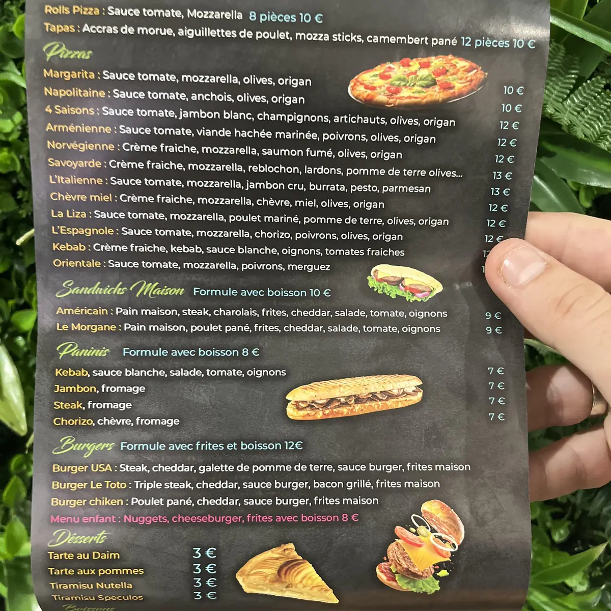 Neben Pizzen umfasst die Speisekarte frische Sandwiches, die mit im Ofen gebackenem Pizzateig zubereitet werden, Burger, Entrecote, Paninis und eine Auswahl an Desserts. Eine besondere Erwähnung verdient die innovative Formel "Freitags ist alles erlaubt", bei der alle Pizzen zum Mitnehmen für zehn Euro angeboten werden.