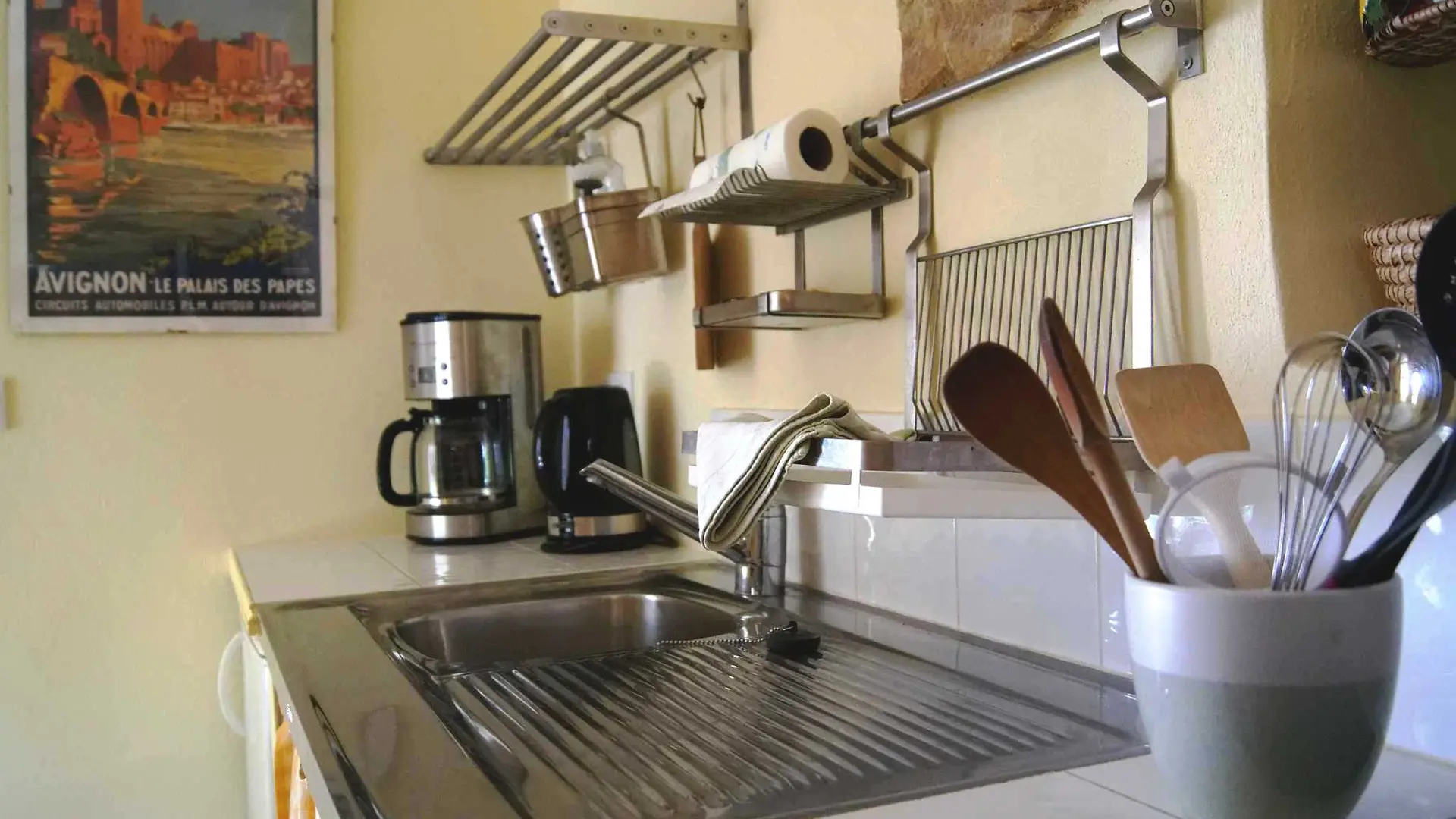 Dieses Ferienhaus mit seinem eigenen Eingang befindet sich im Erdgeschoss und geht auf den Garten hinaus. Von der Terrasse, die mit einer Pergola überdacht und mit einem Tisch und Stühlen ausgestattet ist, haben Sie einen herrlichen Blick auf die Weinberge, den Mont Ventoux und die Dentelles de Montmirail. Via Venaissia.