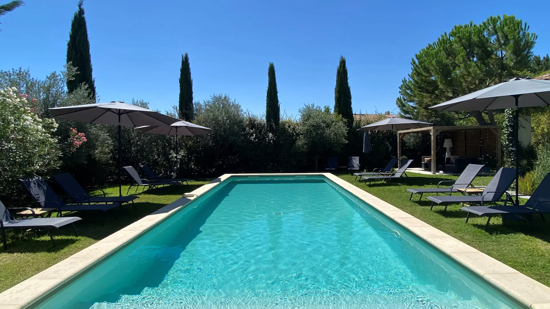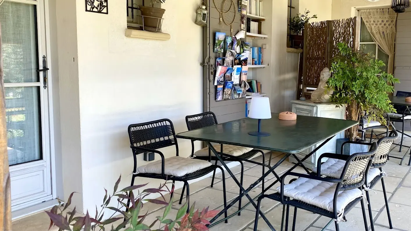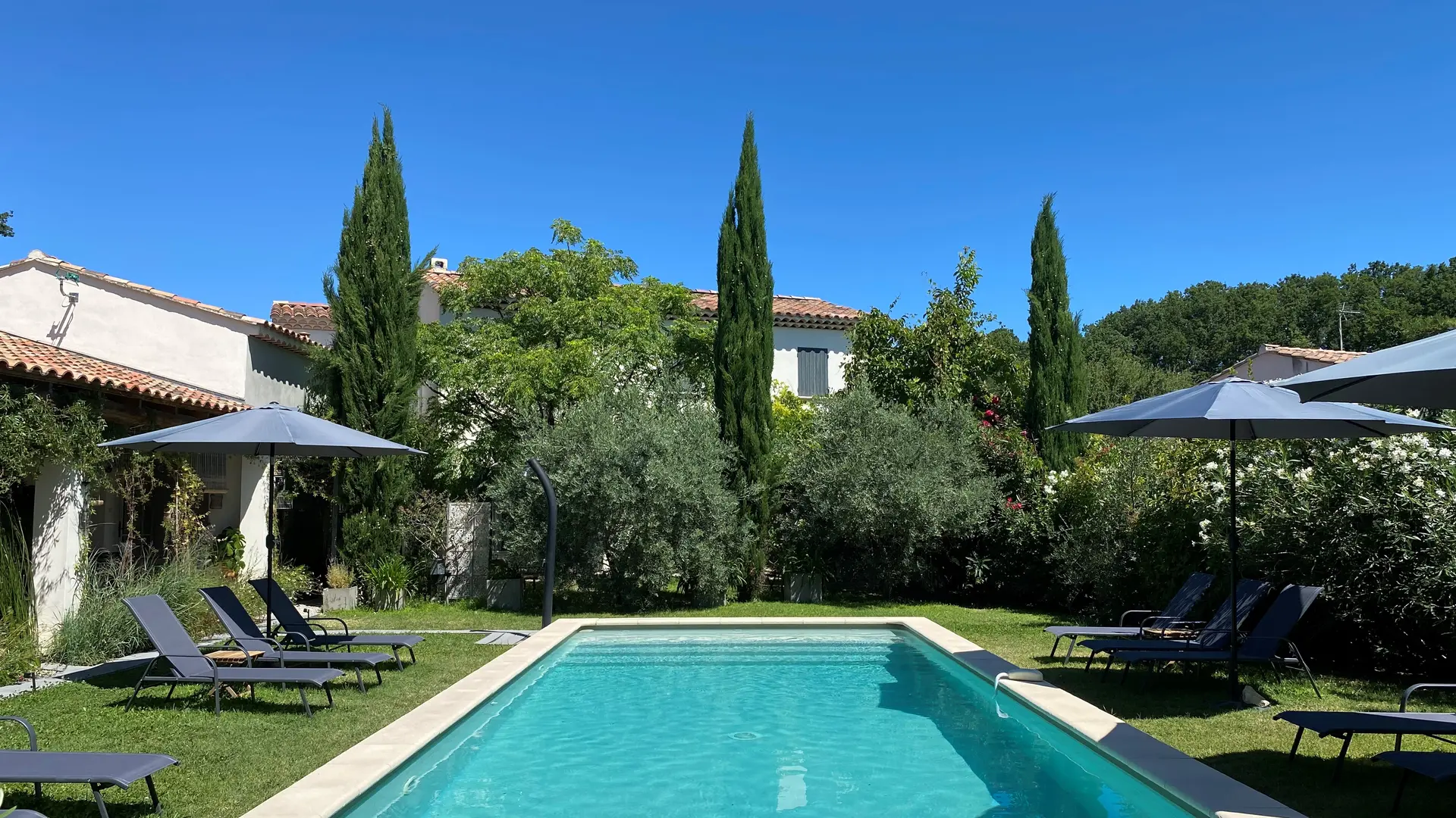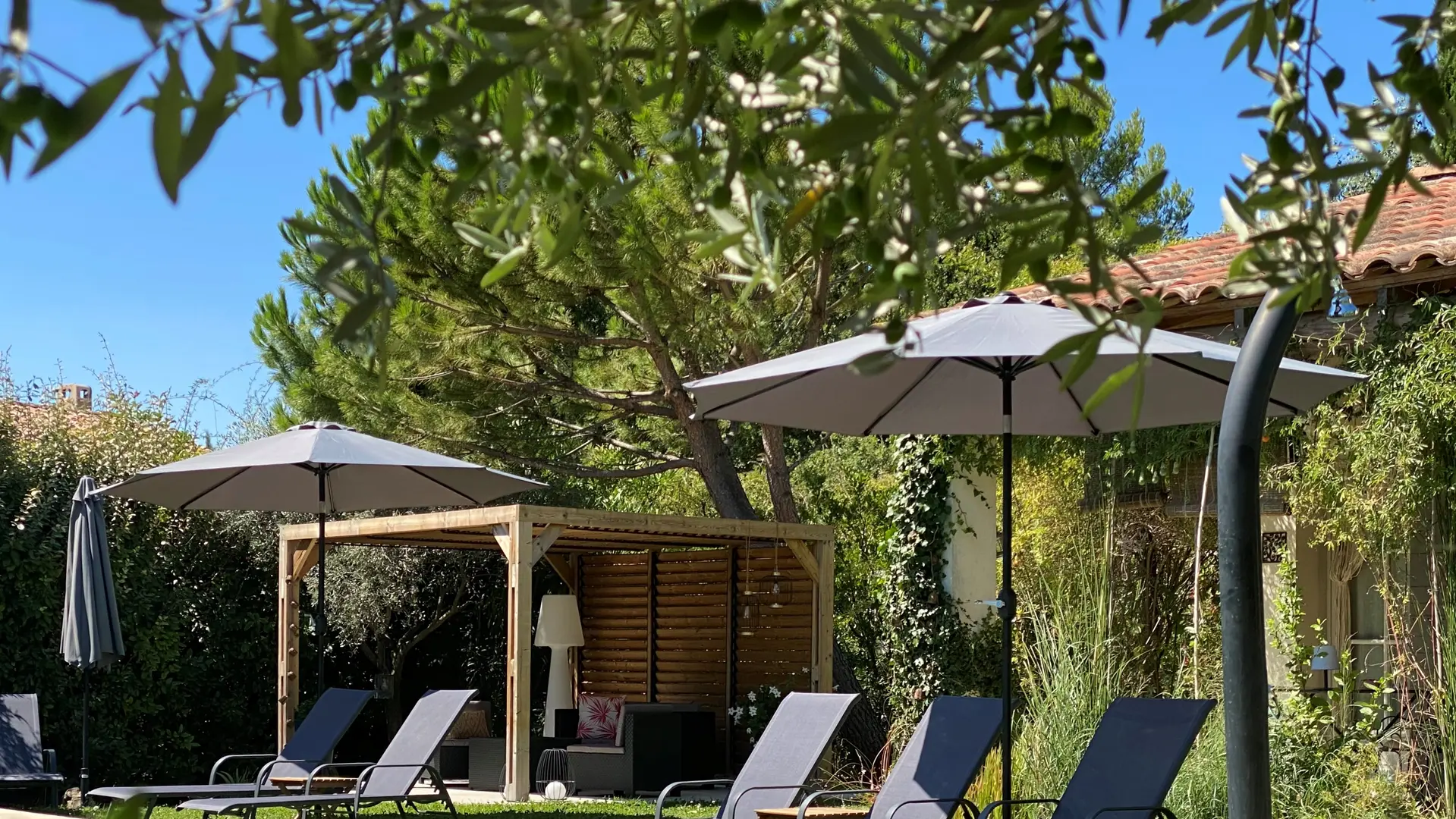 Zwei Terrassen: eine überdachte gegenüber dem Pool und auf der anderen Seite der Wohnung, gartenseitig mit dem kühlenden Carpentras-Kanal, im Schatten eines großen Sonnenschirms. Gasgrill zur gemeinsamen Nutzung.