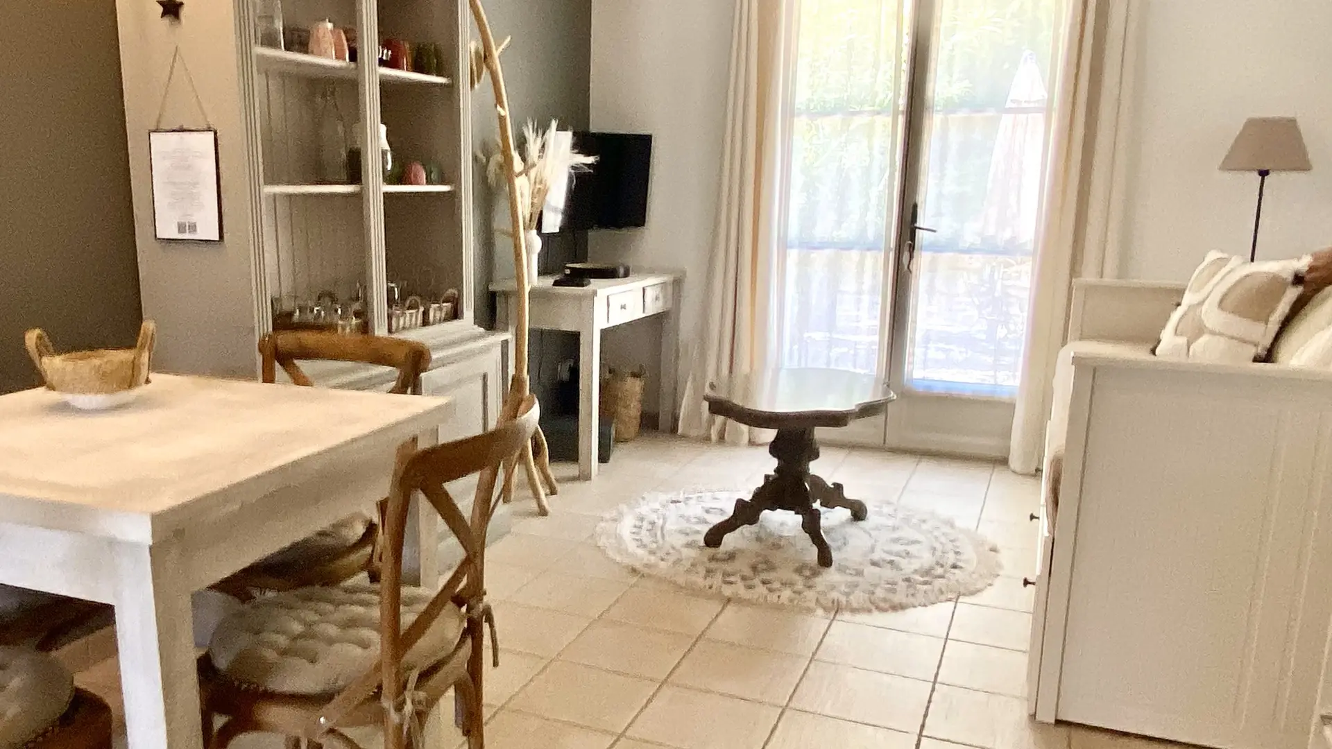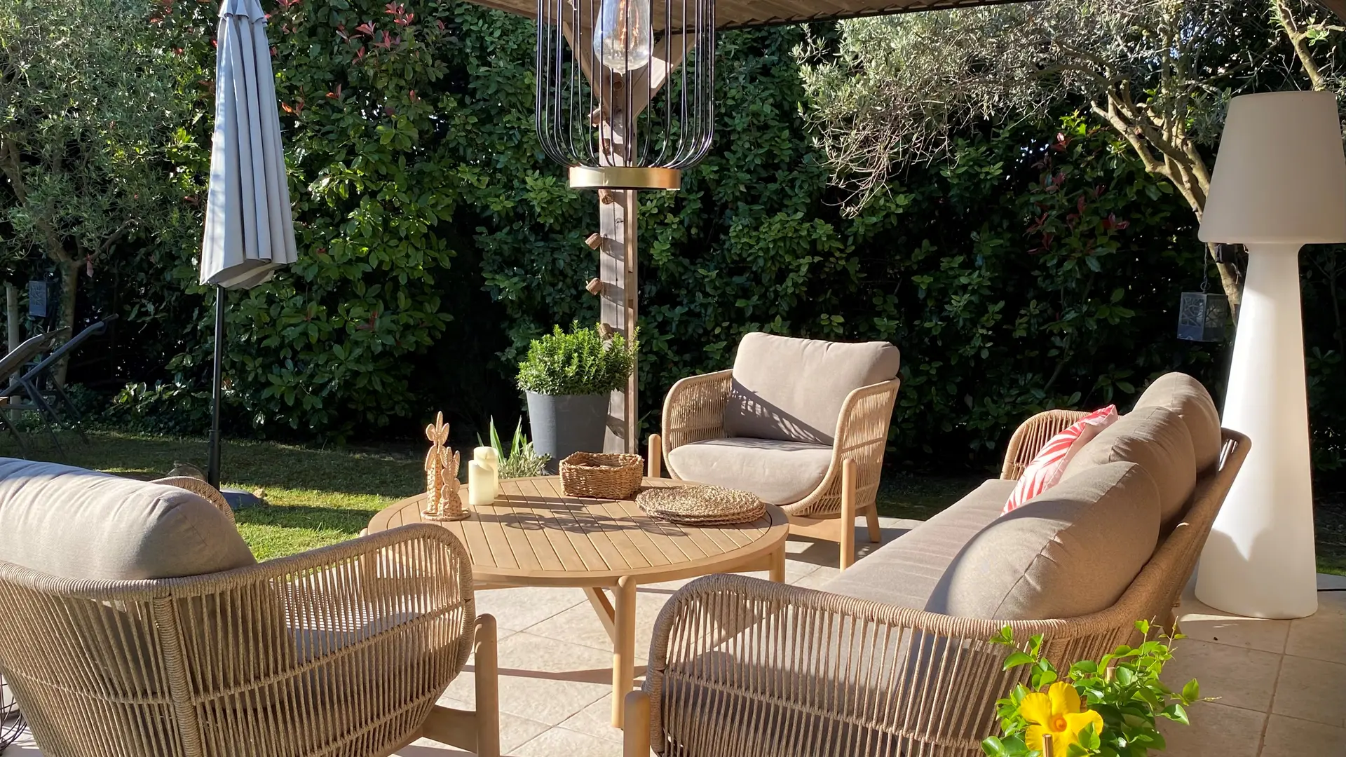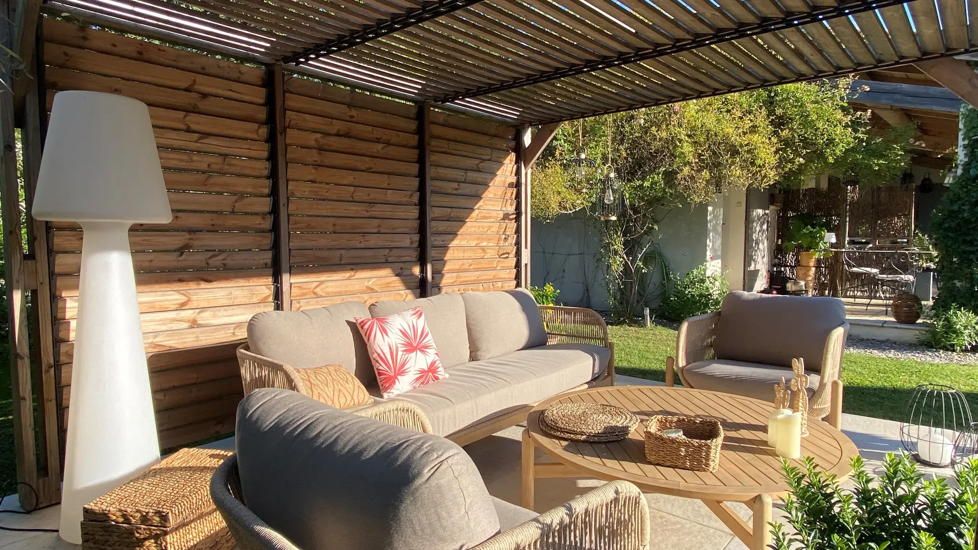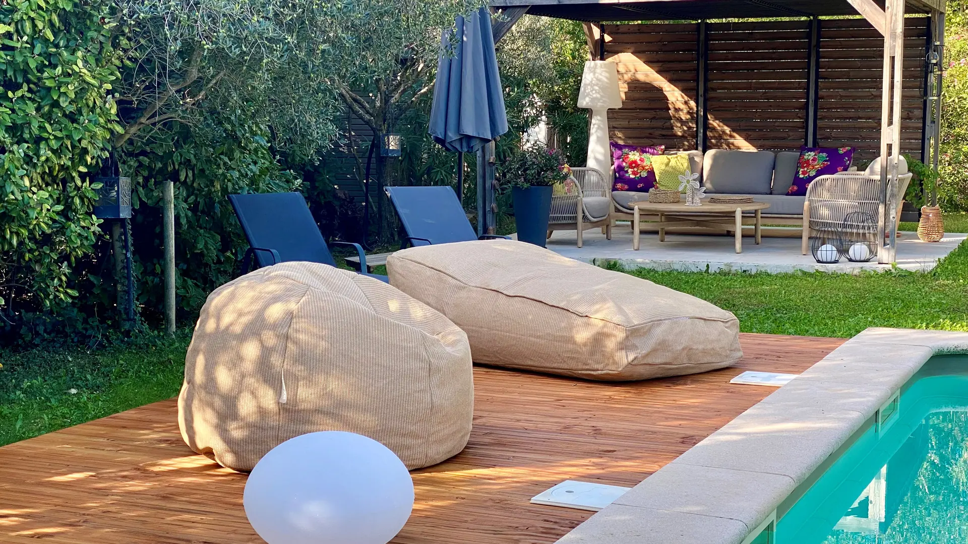 Zwei Terrassen: eine überdachte gegenüber dem Pool und auf der anderen Seite der Wohnung, gartenseitig mit dem kühlenden Carpentras-Kanal, im Schatten eines großen Sonnenschirms. Gasgrill zur gemeinsamen Nutzung.