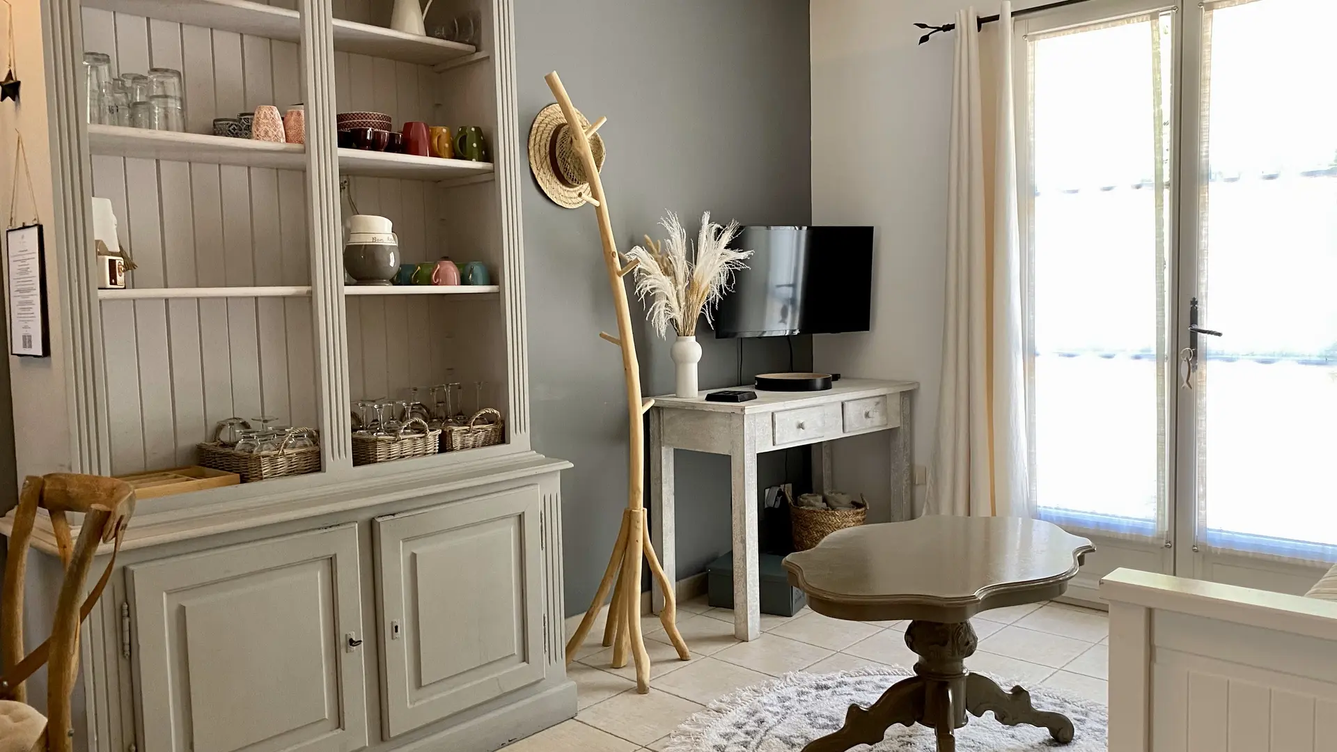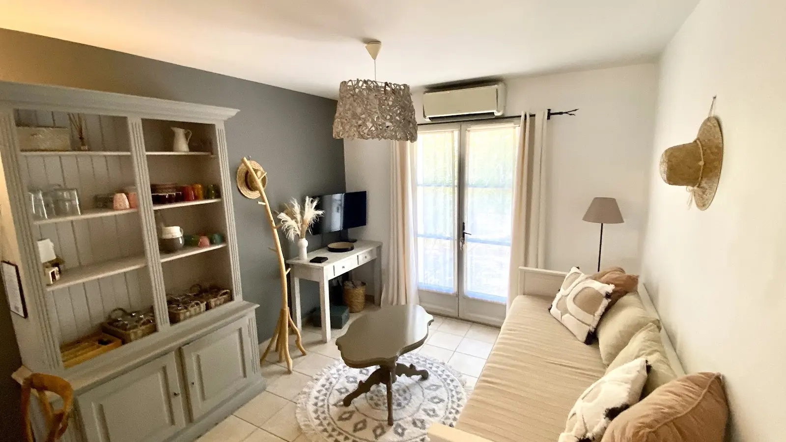 Wohnzimmer mit Fernseher und Schlafcouch für ein oder zwei Personen. Vollständig ausgestattete Kochnische (Kühlschrank, Geschirrspülmaschine, Mikrowelle, Induktionsplatte, Geschirr, Waschmaschine, Nespresso-Kaffeemaschine...).