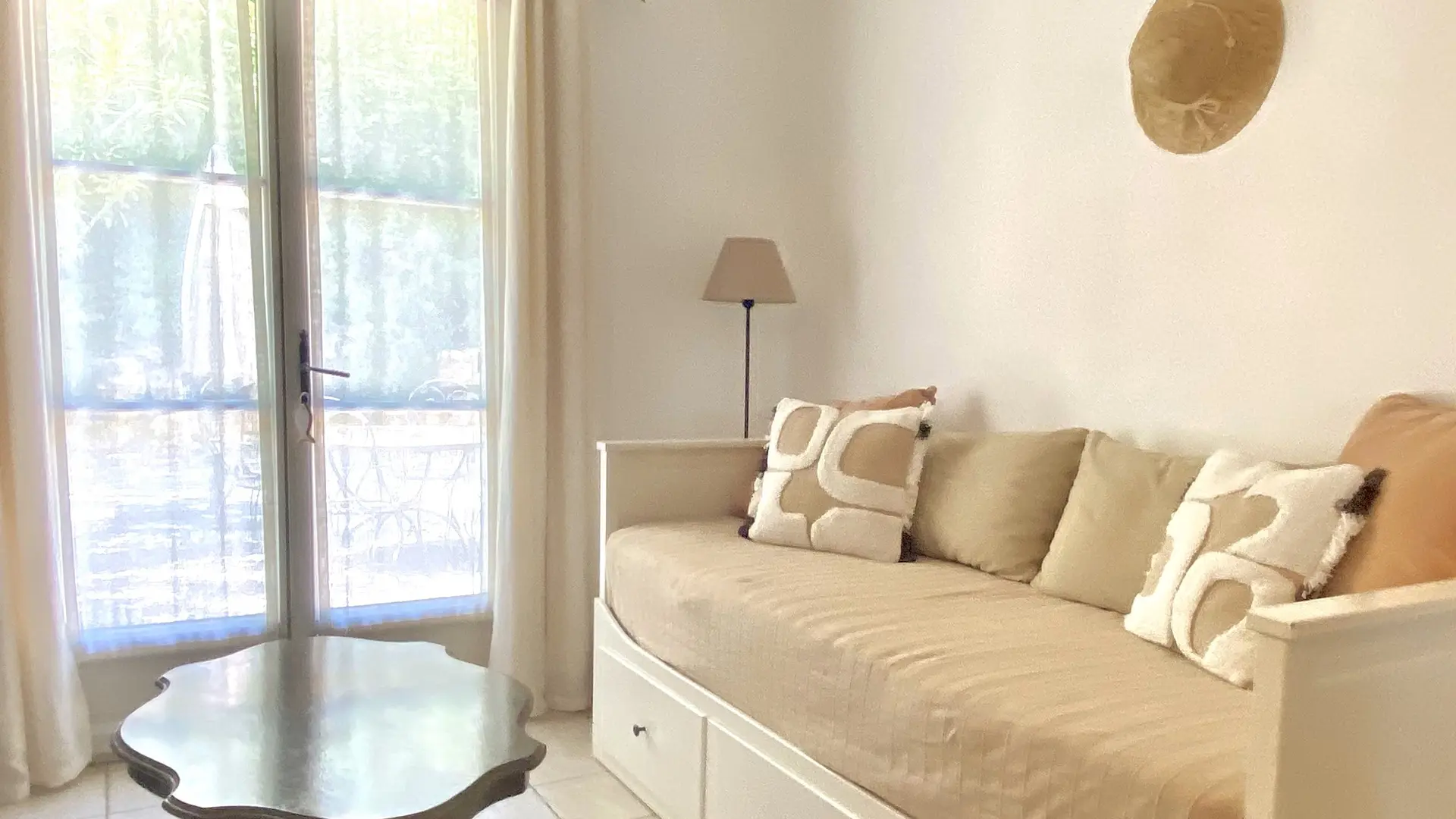 Erstklassige Ausstattung in dieser hübschen Wohnung im Erdgeschoss in einem Nebenflügel der Villa des Besitzers, in einem Wohnviertel mit Pool (10x4 m) und Blick auf den Landschaftsgarten, mit Terrasse nach Osten und Terrasse nach Westen, neben einem Gästezimmer und einer weiteren Wohnung.