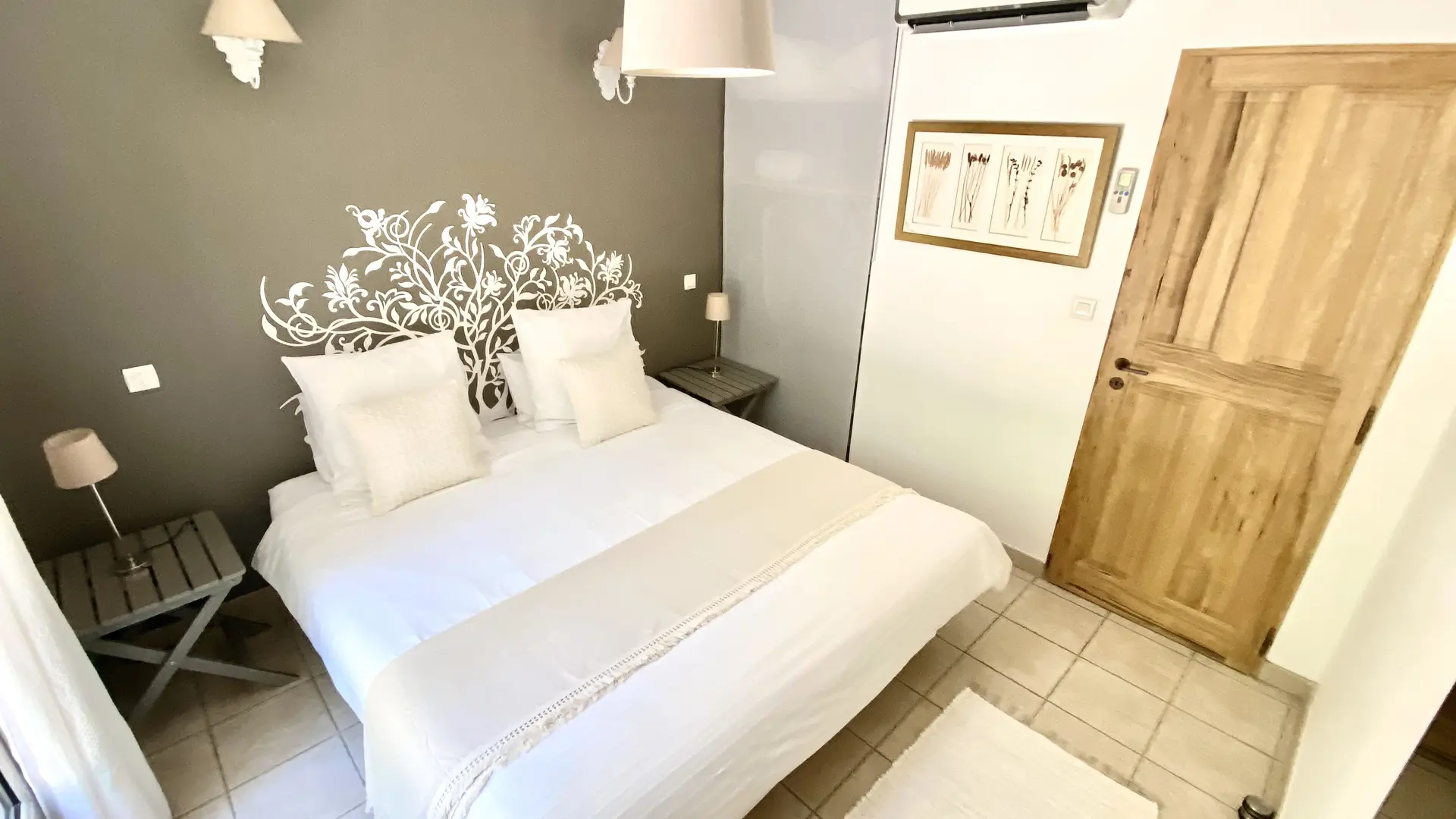 Ferienunterkunft für zwei bis vier Personen (40 m²) mit getrenntem Schlafzimmer mit 2 Einzelbetten 90x200 oder 1 Doppelbett mit 180 cm. Badezimmer mit bodenebener Dusche mit beigem Kieselsteinboden, Wand-WC.