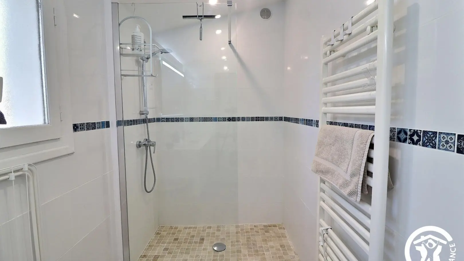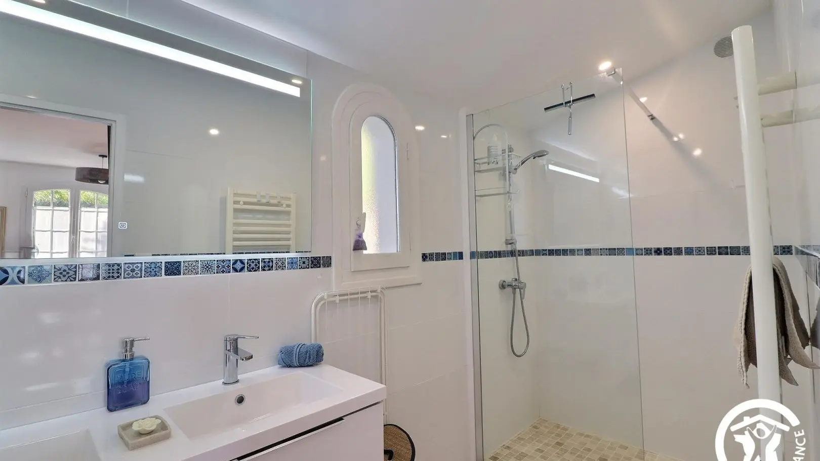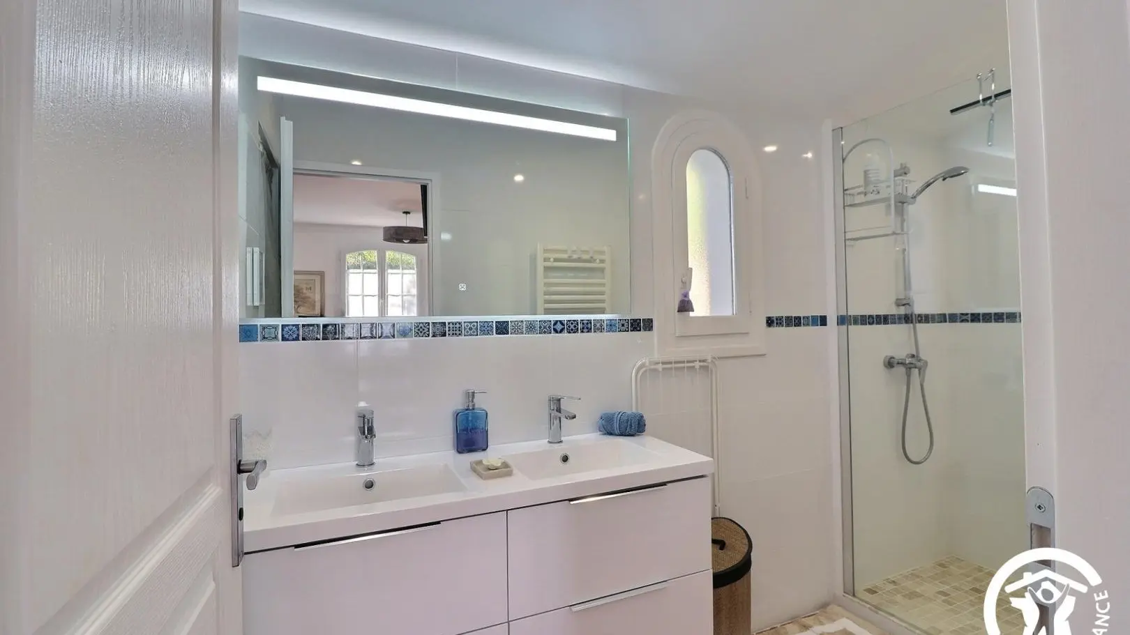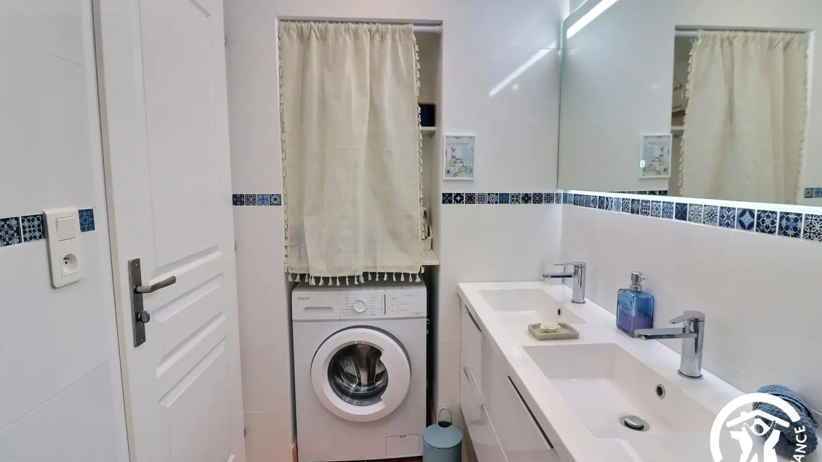 - Ein Badezimmer mit Doppelwaschbecken, ebenerdiger Dusche, beheiztem Handtuchhalter und Waschmaschine.