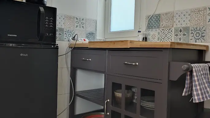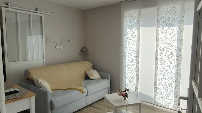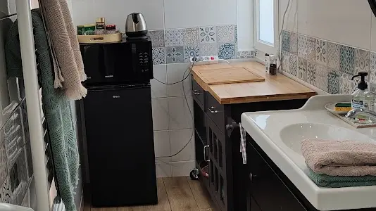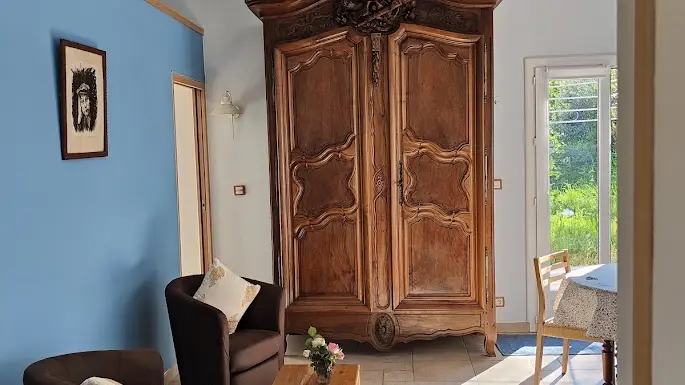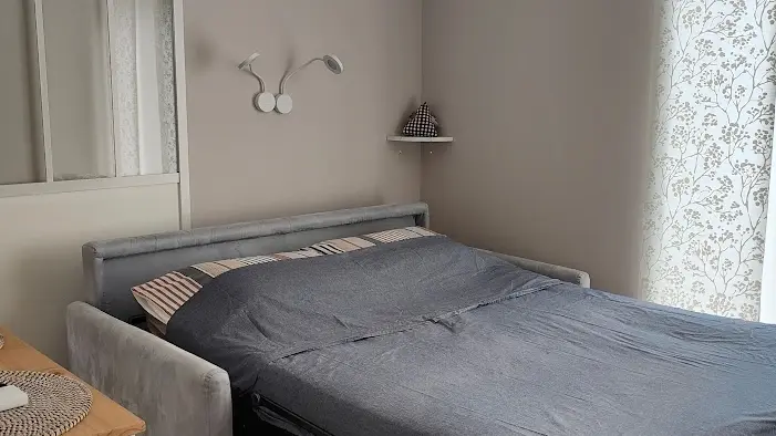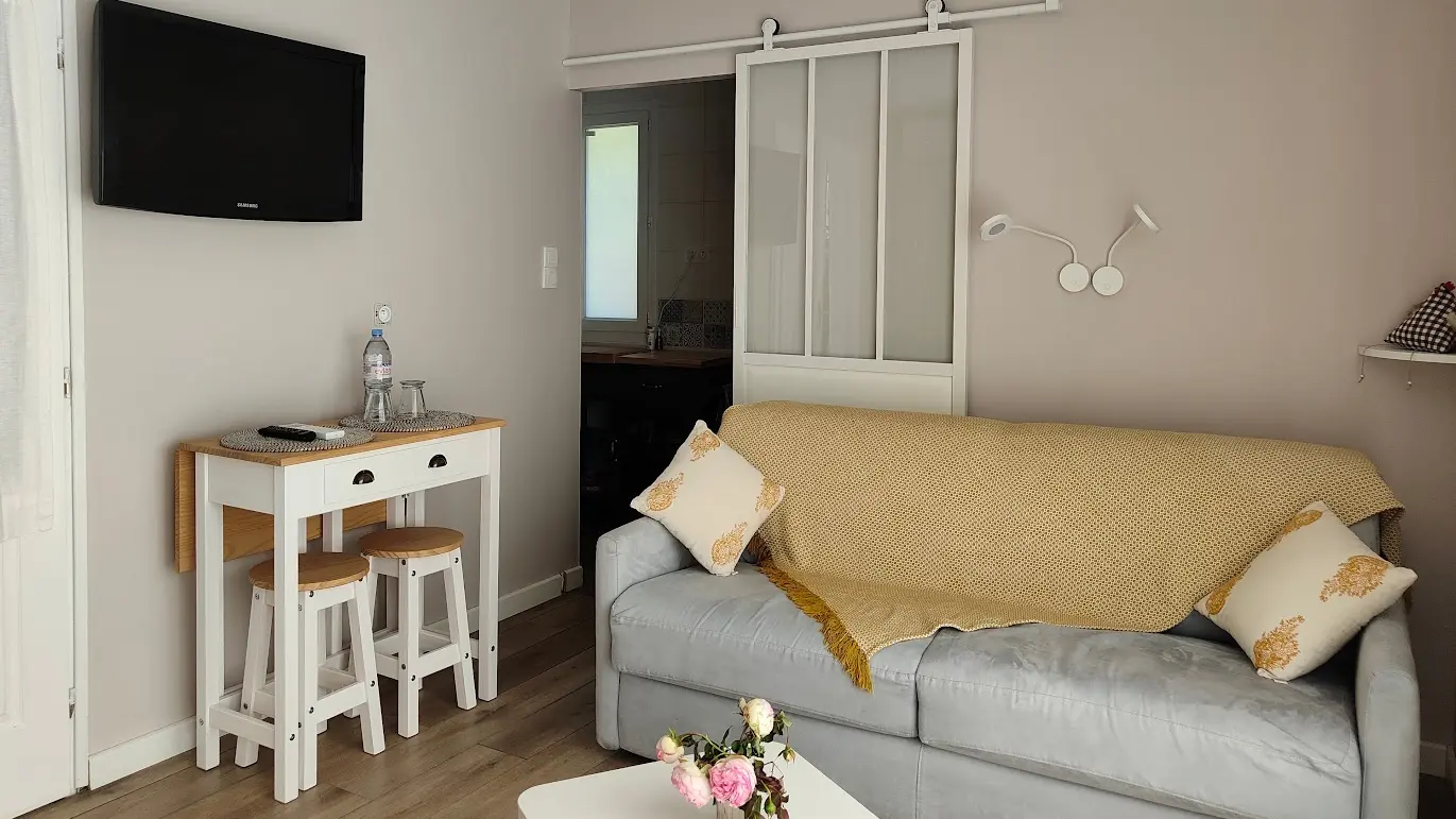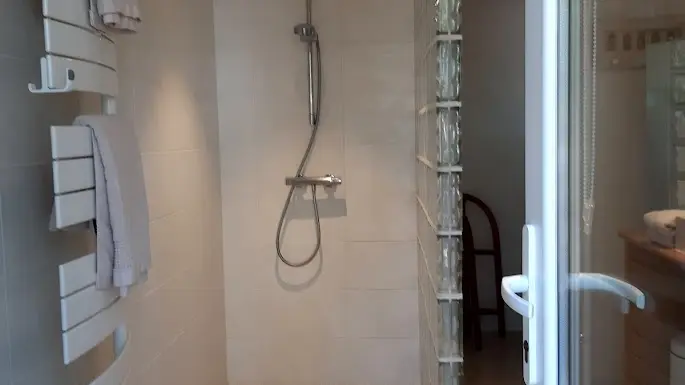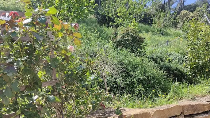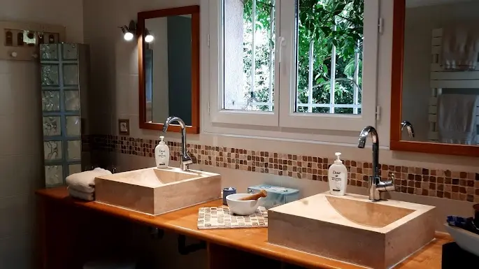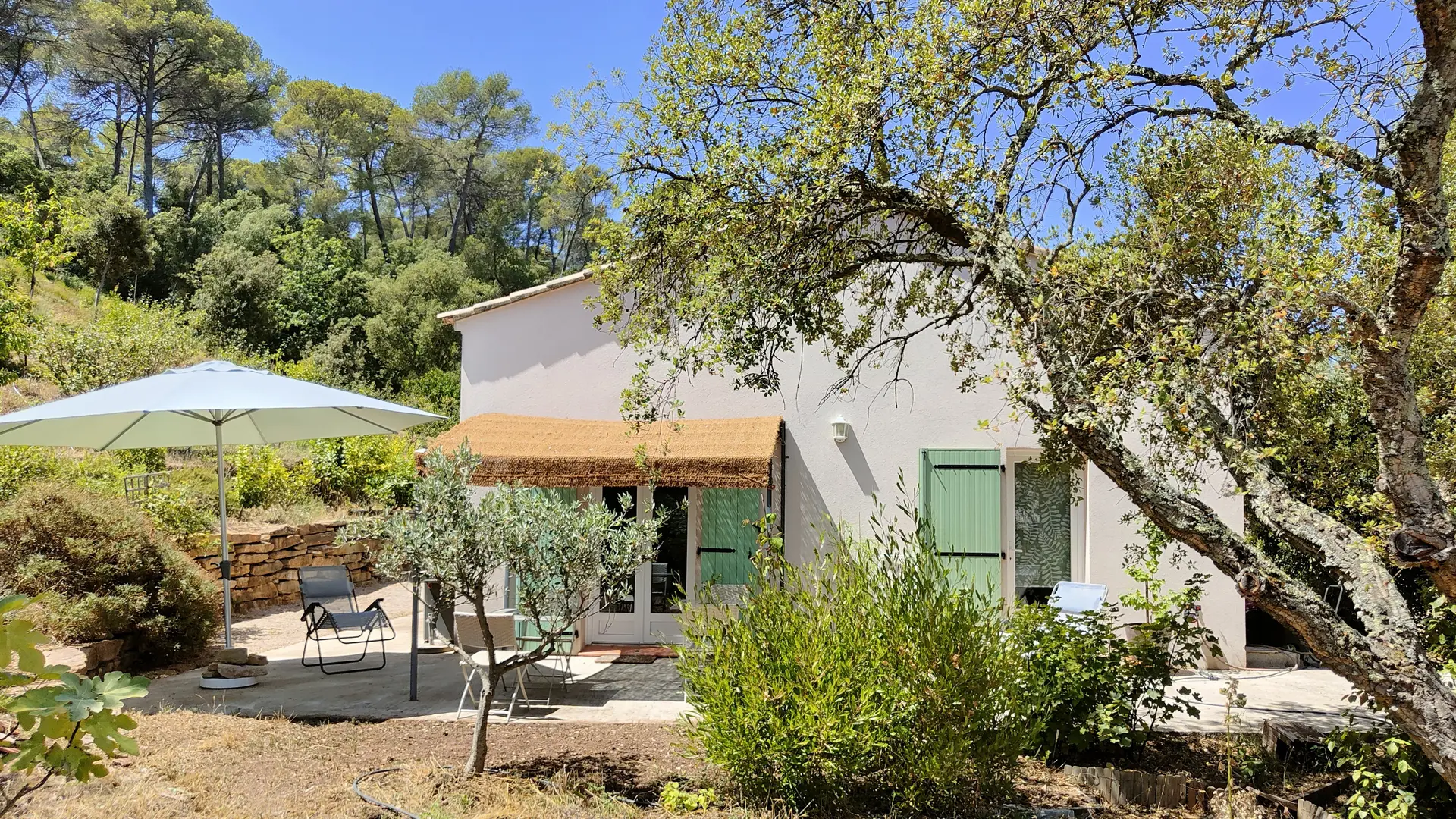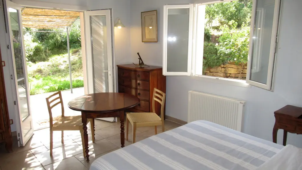 - ein großes, helles Zimmer mit Kathedraldecke, das über eine Terrasse mit Pergola und Gartenmöbeln verfügt, in einer ruhigen Umgebung mit Panoramablick auf das Massif des Maures. Es verfügt über ein Badezimmer mit begehbarer Dusche und zwei Waschbecken.