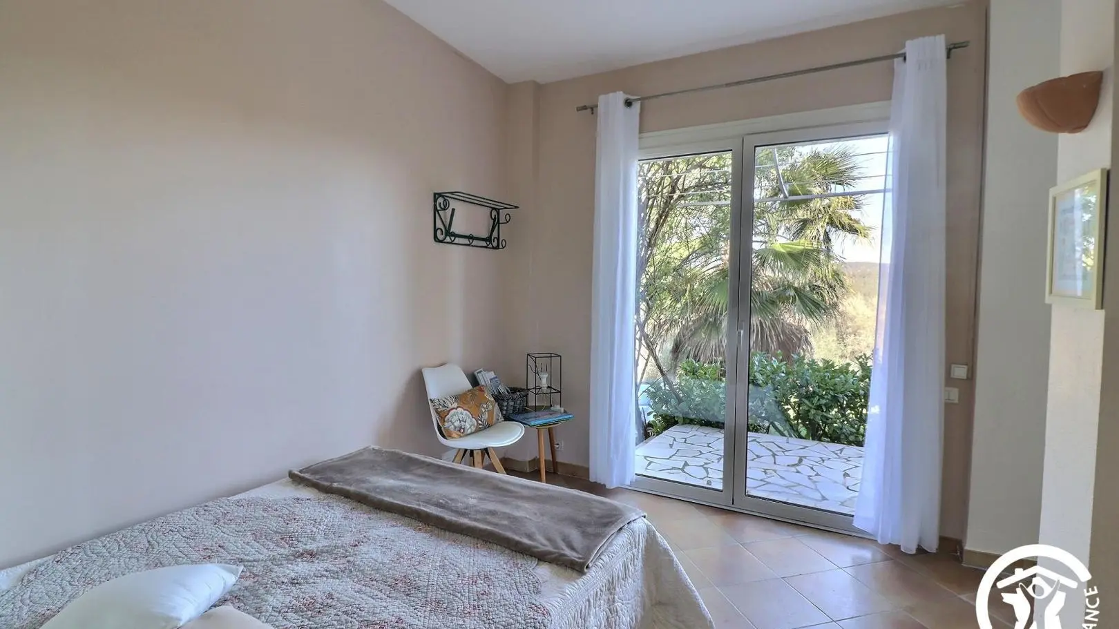 Das gemütliche Schlafzimmer öffnet sich direkt zur Terrasse und verfügt über ein Doppelbett (140x190). Es ist mit einem Badezimmer mit ebenerdiger Dusche und separater Toilette verbunden.