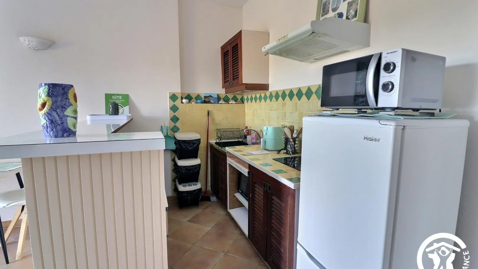 Der Innenbereich besteht aus einem hellen Wohnzimmer mit Essbereich, einem Sofa (umwandelbar für eine weitere Person – 50 €/Woche) und einer voll ausgestatteten Küche mit Kühlschrank, Gefrierschrank, 2-Flammen-Cerankochfeld, Mini-Backofen, Mikrowelle und Kleingeräten. Für Ihre Momente der Entspannung steht Ihnen auch ein Fernseher zur Verfügung.