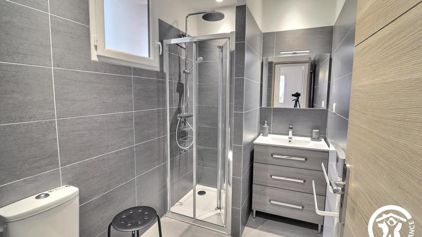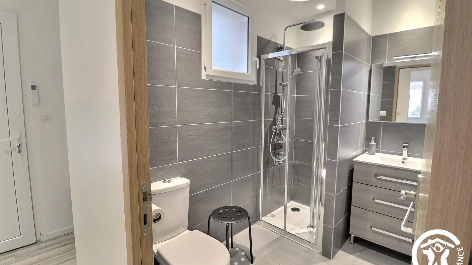 - Duschraum mit 80 x 80 cm großer Dusche, Waschbecken, WC und Handtuchhalter. Im Obergeschoss der Schlafbereich: