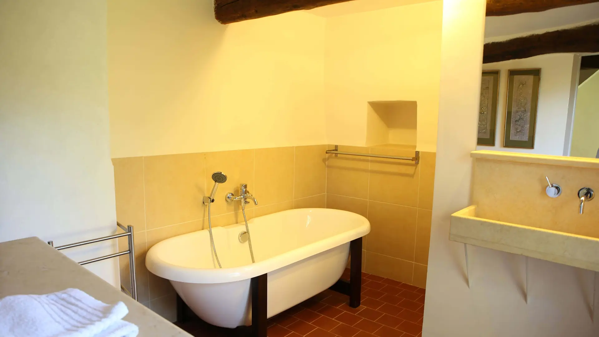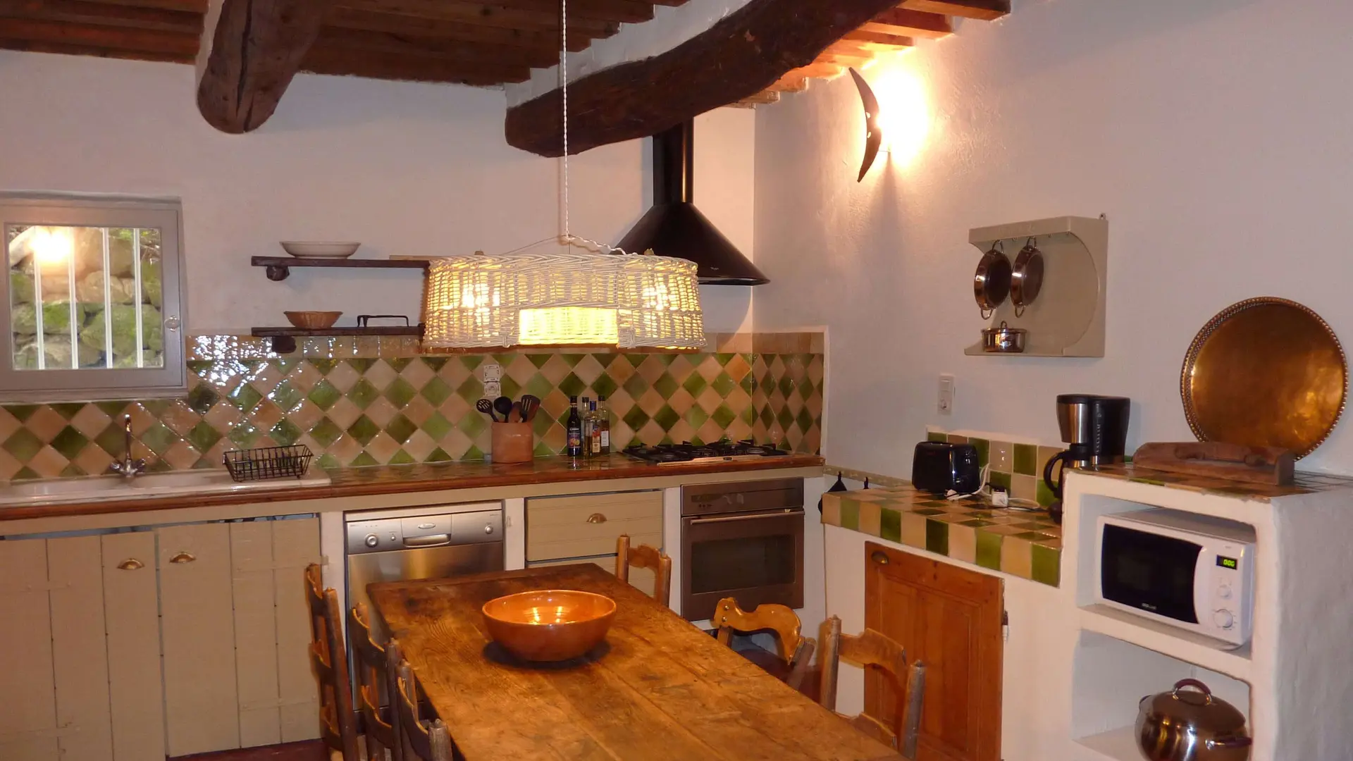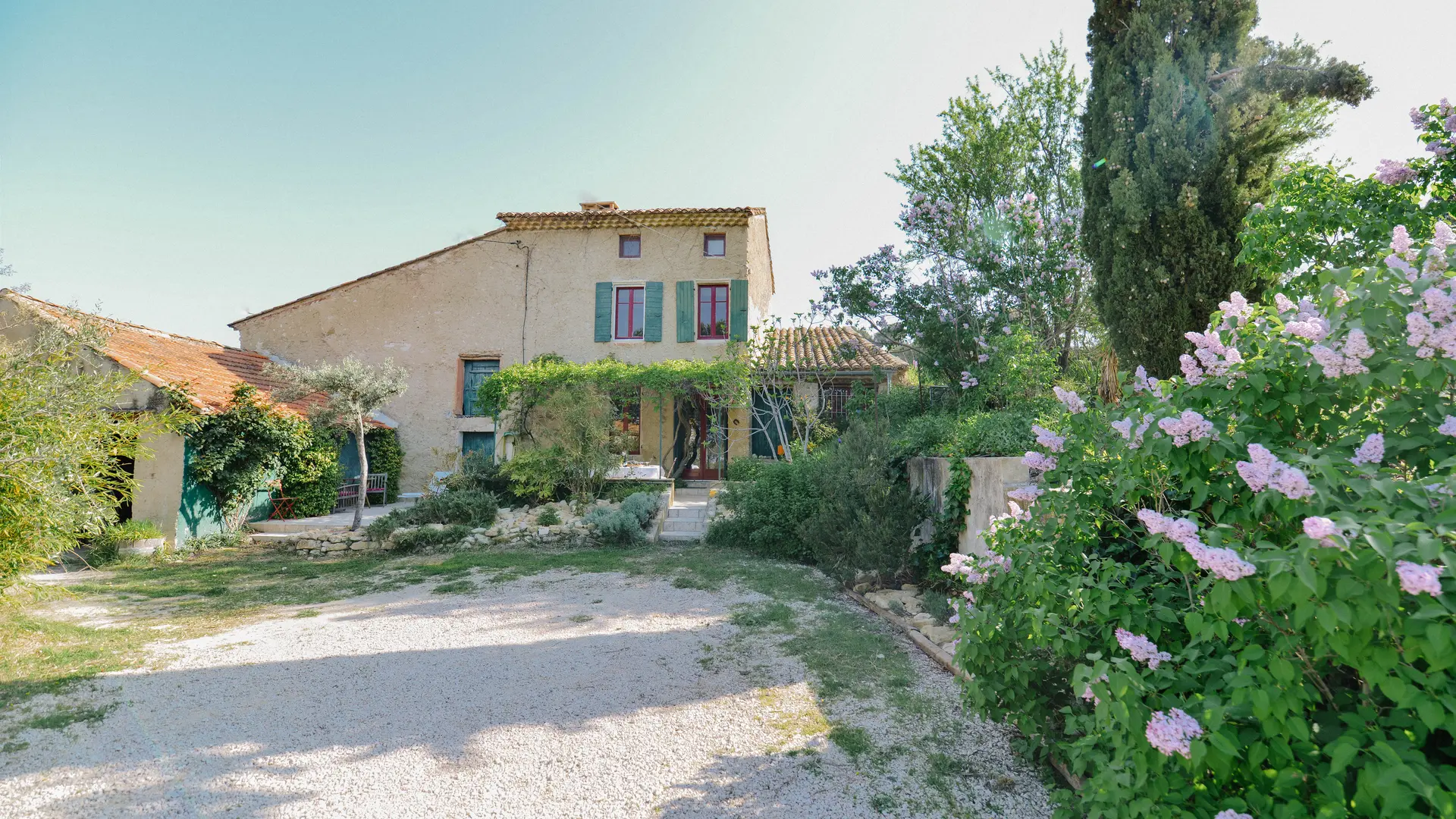 Schöner Blick auf die Dentelles de Montmirail, Lage an den Wanderwegen und Côtes-du-Rhône-Weinfeldern. Ebenerdig separate, voll eingerichtete Küche. Wohnraum mit Couch, 2 Schlafzimmer, 1 großes Bett (160 cm), 2 Einzelbetten. Heiz-/Klimagerät. Kinderbett. Kamin. WLAN. Inkl. Heizung, Hauswäsche, Kurtaxe.