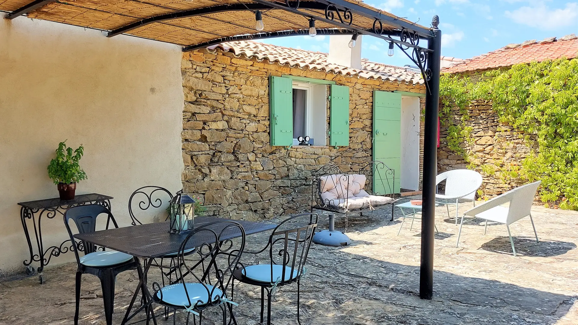 Sie betreten das Ferienhaus über eine schöne private Terrasse aus Stein mit Gartenmöbeln, einem Tisch und einem elektrischen Grill.