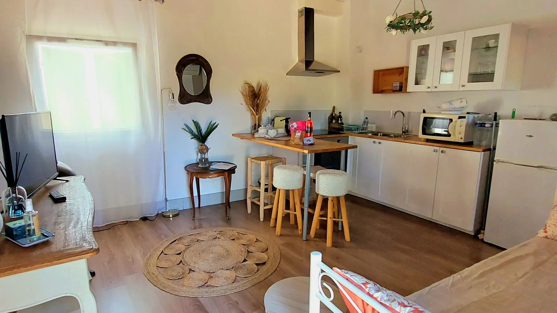 Der Wohnraum empfängt Sie mit einer voll ausgestatteten Küche (Kühlschrank, Elektroherd und Backofen, Nespresso-Kaffeemaschine, Wasserkocher, Toaster, Mikrowelle, Küchenutensilien und Geschirr), die zum Wohnzimmer hin offen ist.
