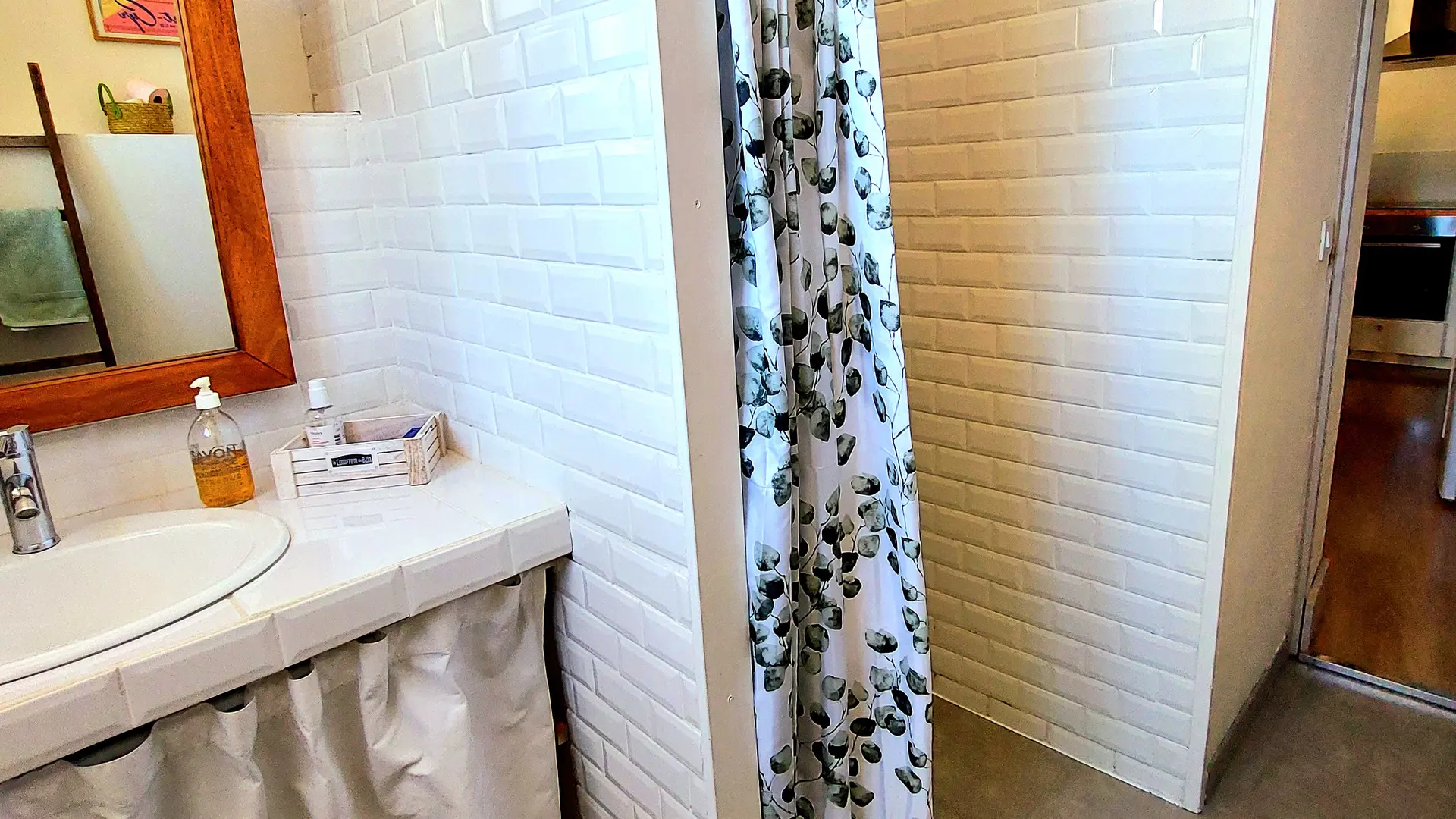 Sie finden ein helles Badezimmer mit einer italienischen Dusche, einem Waschbecken und einer Toilette.
