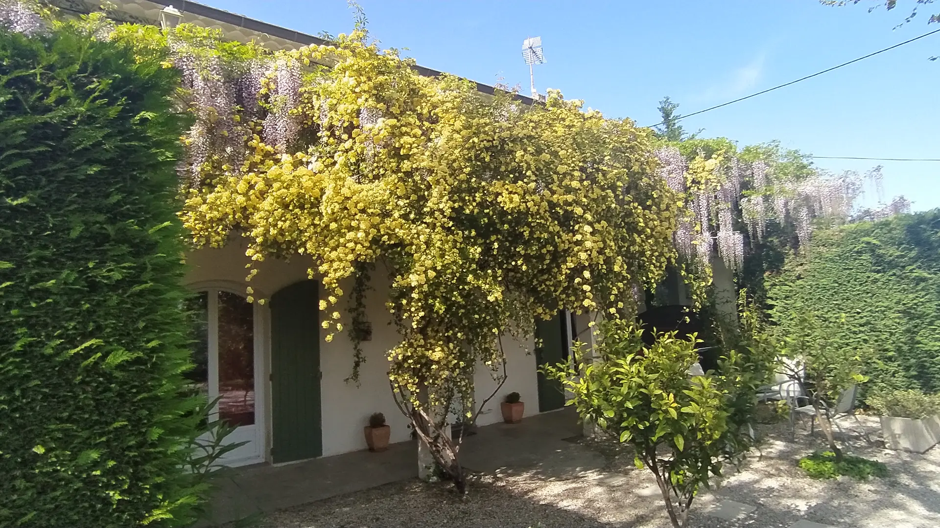 Das Mas de St-Andiol liegt ganz in der Nähe von St-Remy de Provence, am Fuße der Alpilles und der Montagnette. Vor den Toren des Luberon gelegen, ist es der ideale Ausgangspunkt, um die Provence und ihre schönsten Schätze nur wenige Kilometer entfernt zu entdecken. Das Maset des Glycines ist eine einstöckige Unterkunft. Es hat eine schöne private Südterrasse mit Gartenmöbeln im Schatten unserer hundertjährigen Platanen.