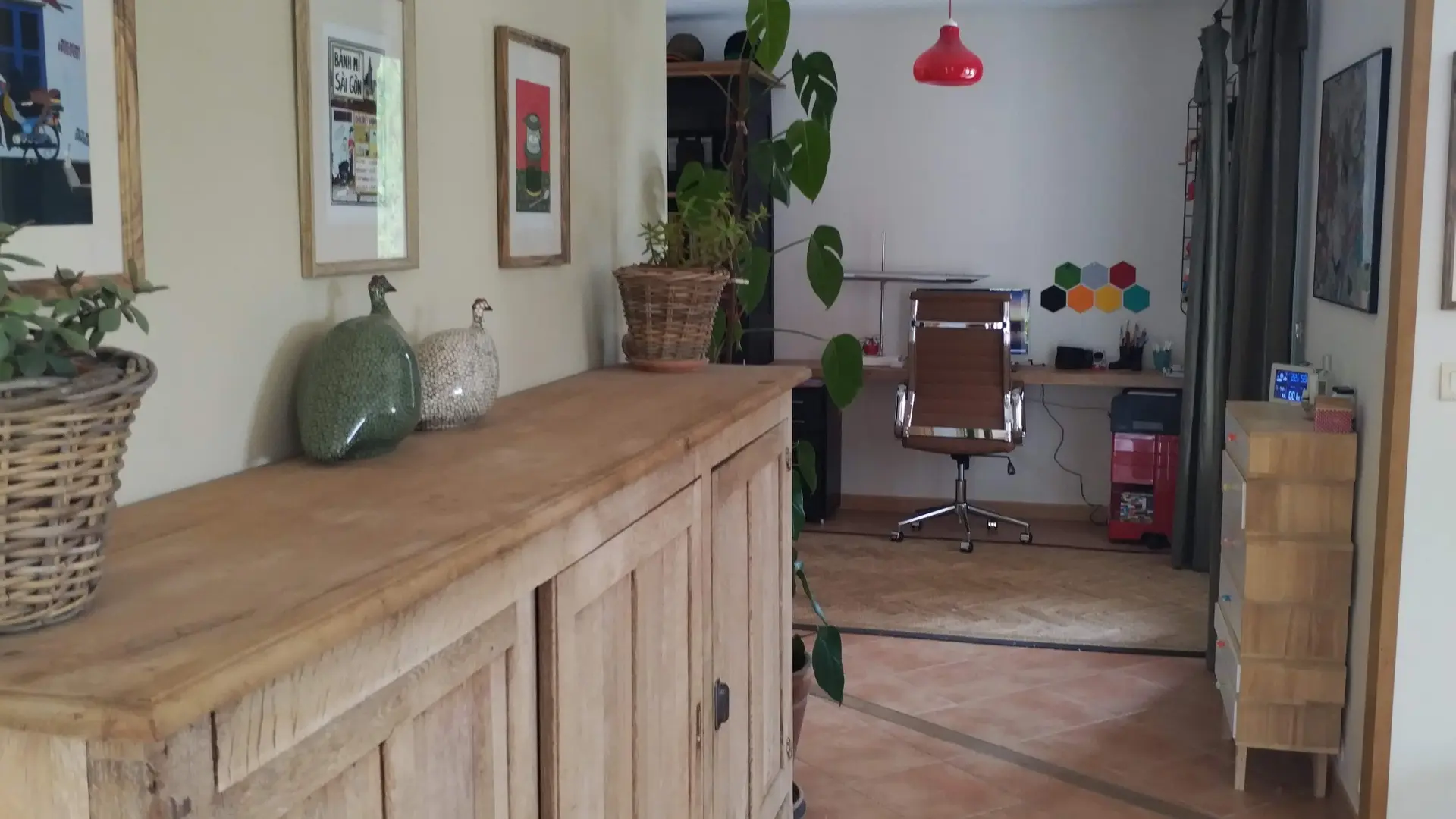 Großes Wohnzimmer offen zur Küche und mit einer kleinen Arbeitsecke.