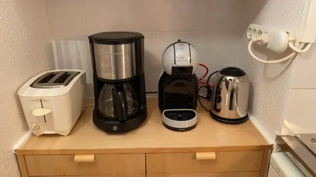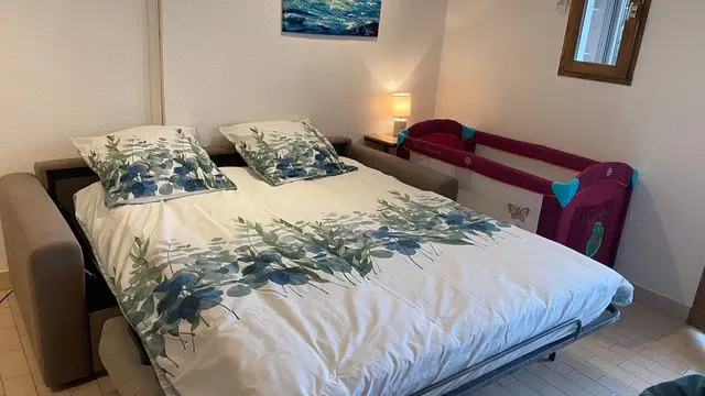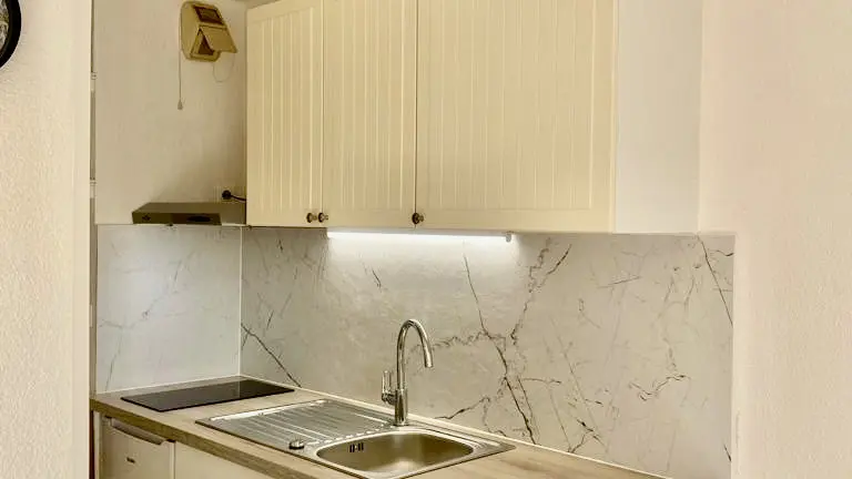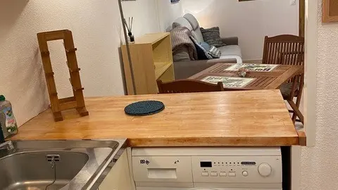 Es besteht aus einem Eingangsbereich, der zum Badezimmer führt, einer separaten Toilette, einer Küchenzeile, einem Wohnzimmer mit einem Schlafsofa (160 x 200 cm) und einer zusätzlichen Schlafmöglichkeit (90 x 200 cm).