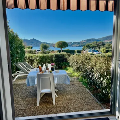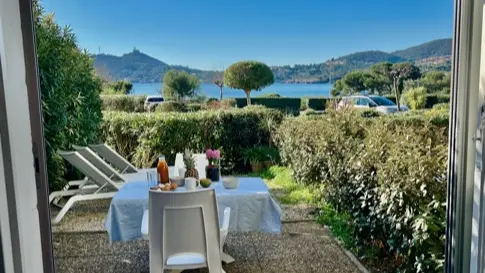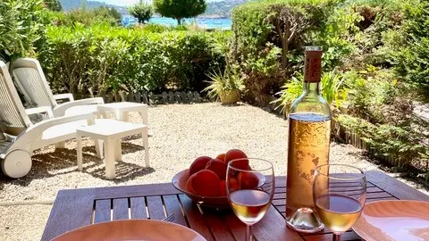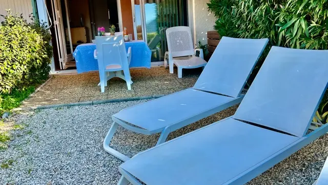 Die Terrasse und der kleine Garten mit Meerblick sind mit zwei Sonnenliegen ausgestattet.