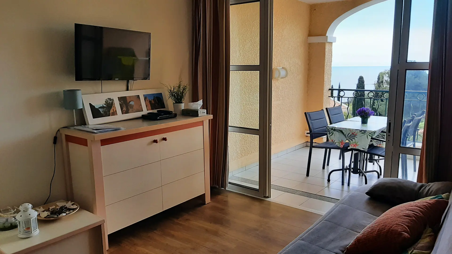 Studio mit Schlafnische, Meerblick, in einer Ferienanlage, einzigartiges Ambiente, Geschäfte (von Ende März bis Ende Oktober geöffnet) in der Nähe, Pool, gut ausgestattet, viel Stauraum, überdachte Terrasse, Parkplatz inbegriffen.