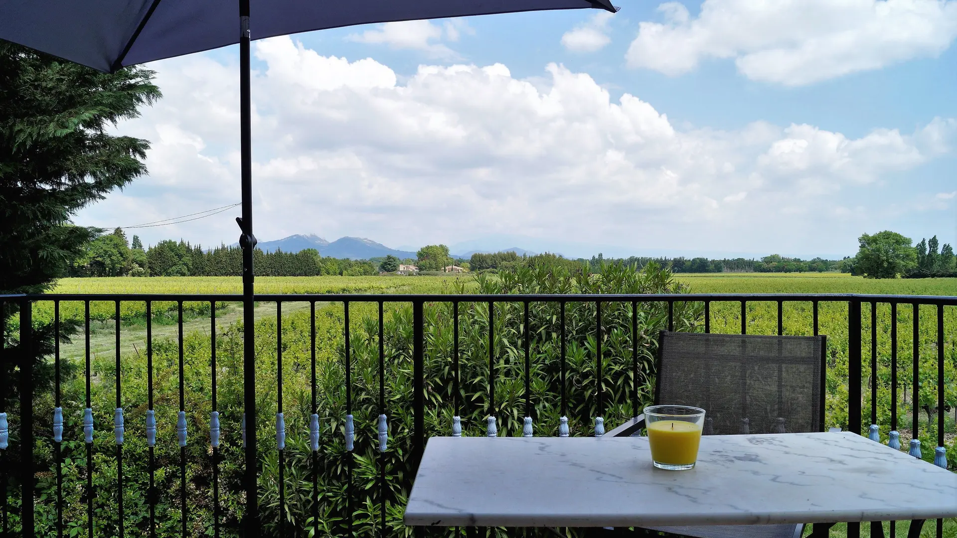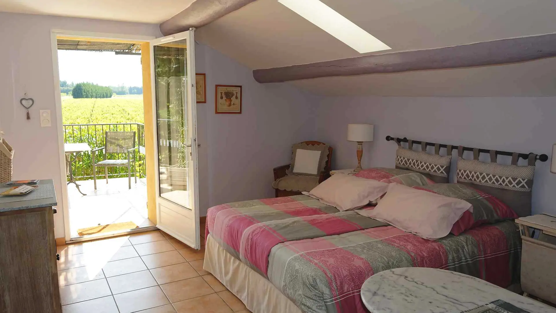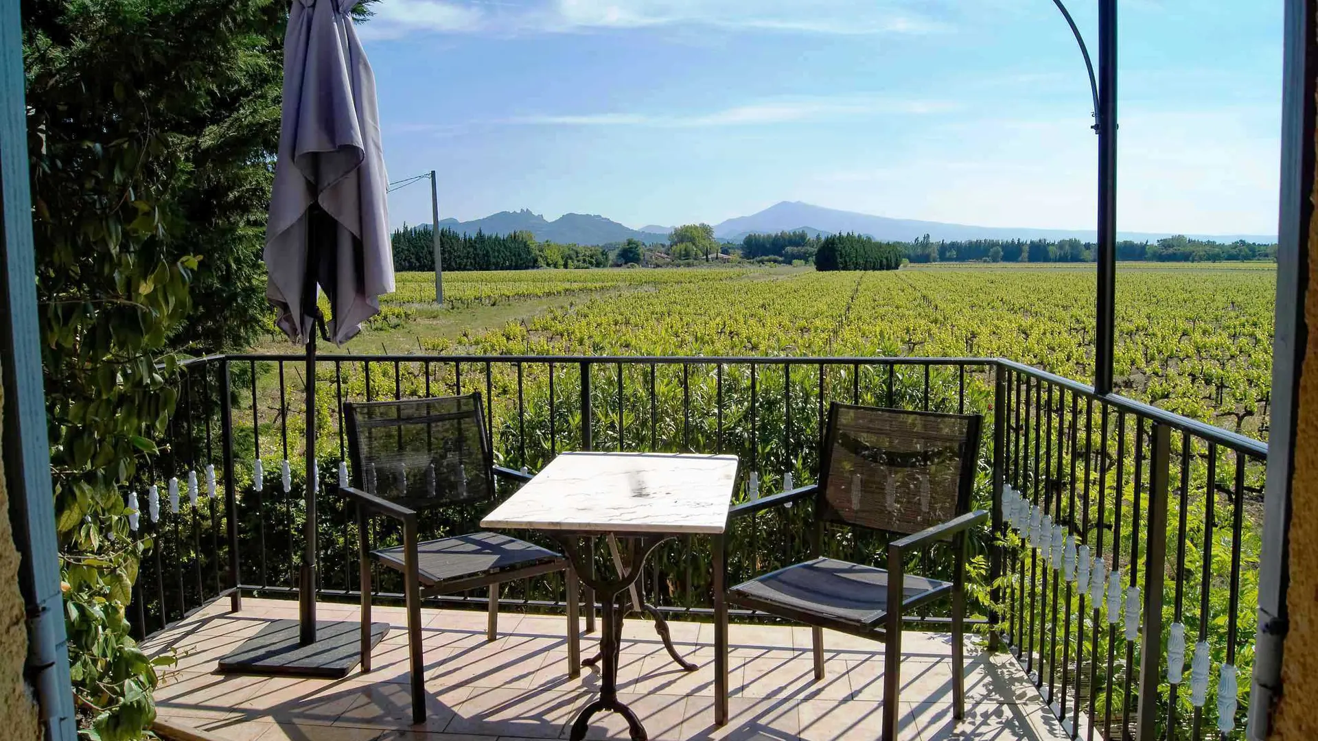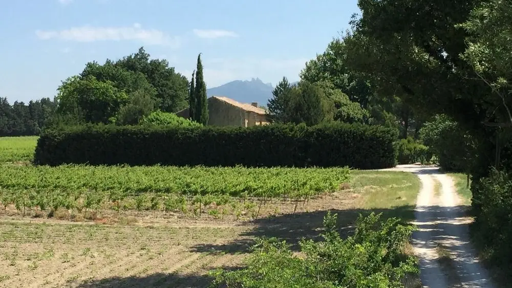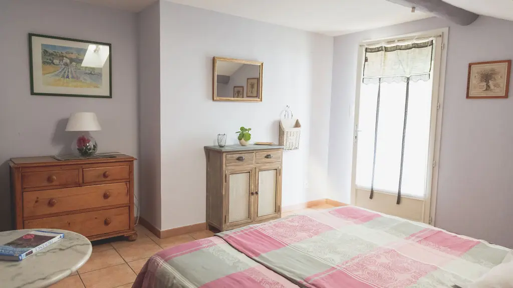 Diese Unterkunft befindet sich am Ende des Mas, im 1. Stock mit einem eigenen Eingang. Von der Terrasse aus, die mit einer Pergola überdacht und mit einem Tisch und Stühlen ausgestattet ist, haben Sie einen herrlichen Blick auf den Mont Ventoux und die Dentelles de Montmirail. Die Via Venaissia ist 100 m entfernt.