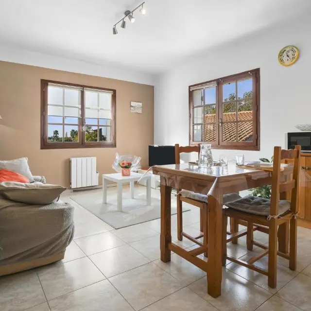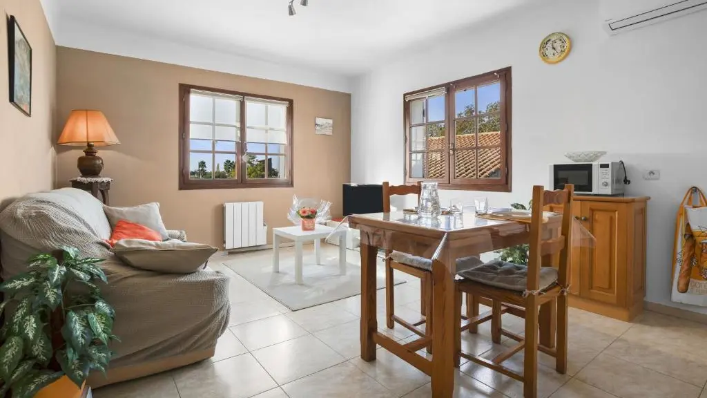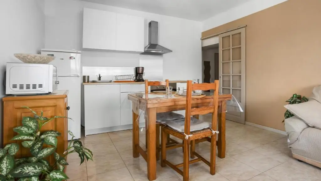 Dieses Studio besteht aus einem großen Raum mit ausgestatteter Küche (außer Geschirrspüler) sowie einem Wohnzimmer (Sofa, Couchtisch, Fernseher). Dieser sehr helle Raum verfügt über zwei Fenster, eines (nach Süden ausgerichtet) mit Blick auf den Innenhof und den Olivenhain, das andere (nach Westen ausgerichtet) mit Blick auf die Landschaft, den Mont Coudon und den Mont Faron.