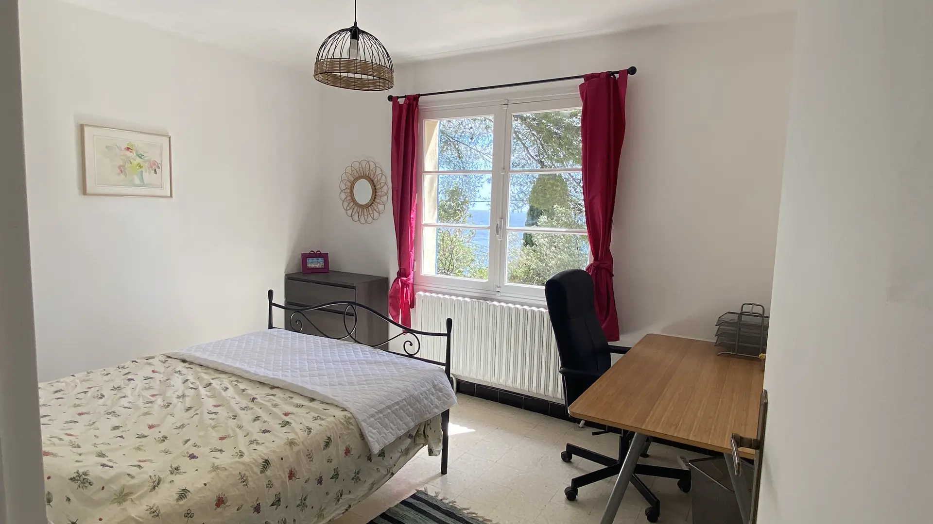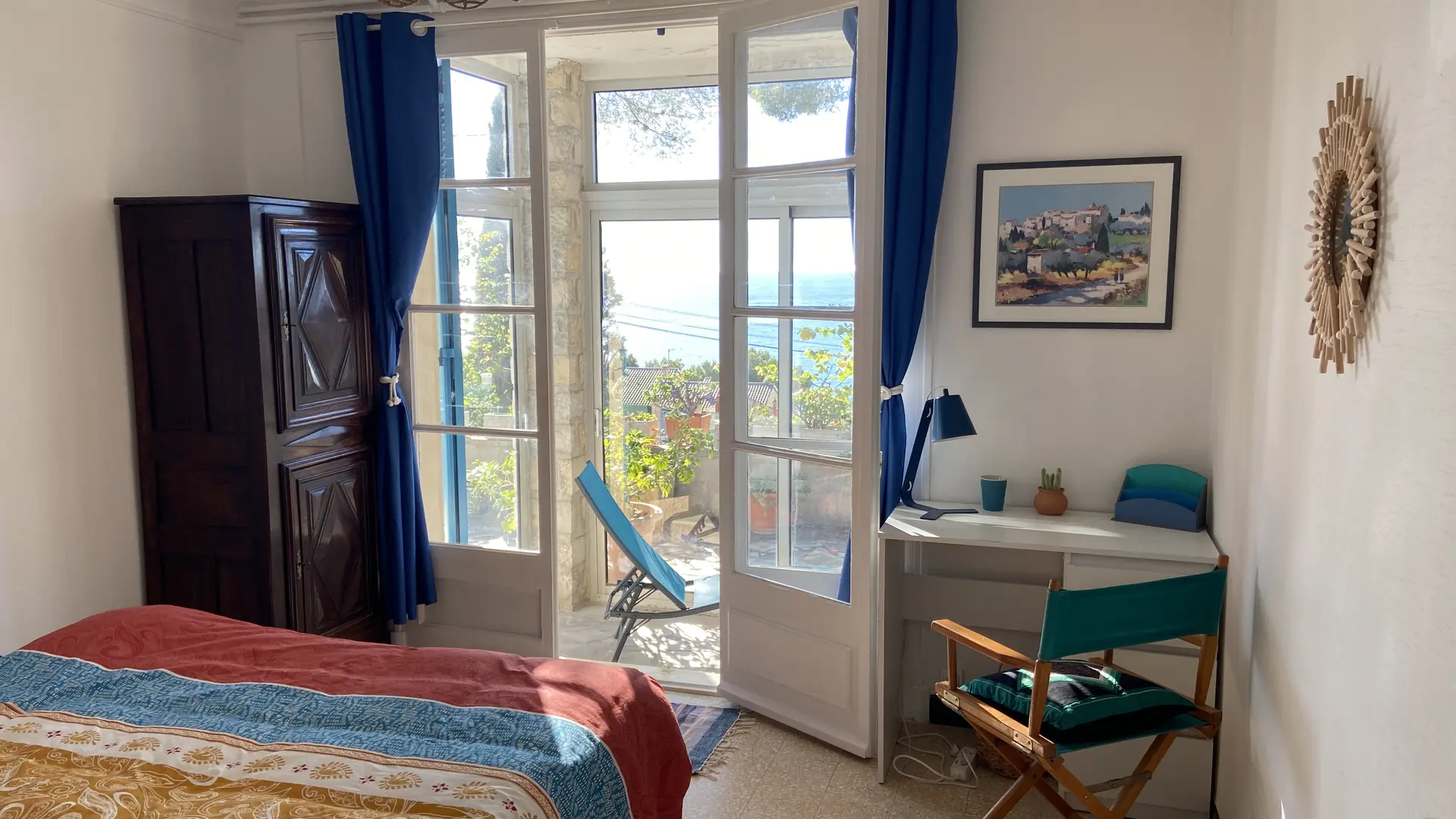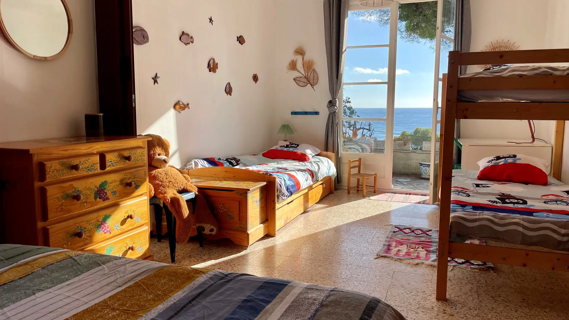 -1 Schlafzimmer mit Doppelbett (140 cm) und 1 Einzelbett, ausgestattet mit einem Schreibtisch, der auf die Veranda führt, Meerblick.