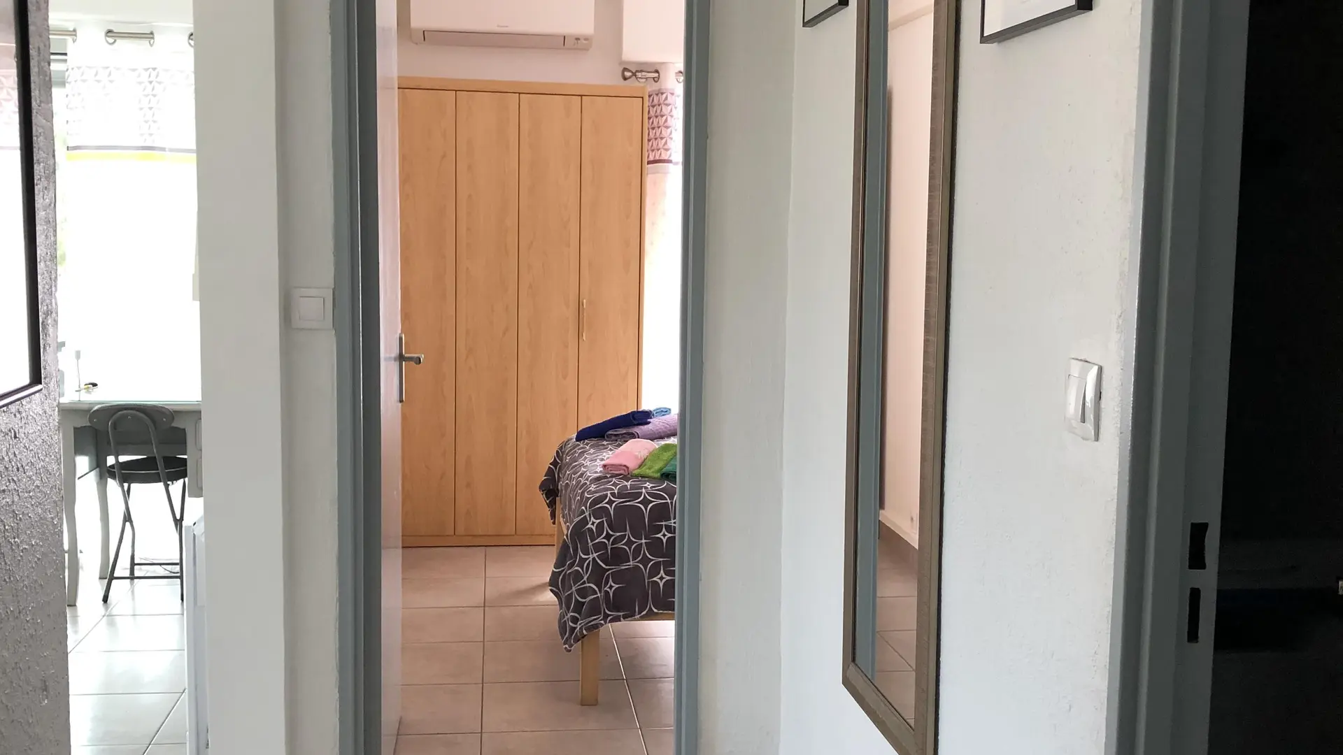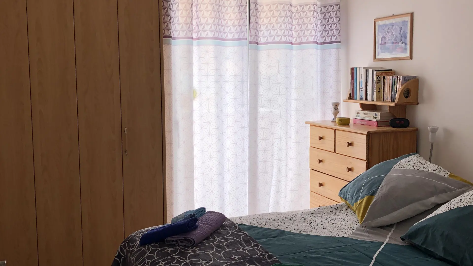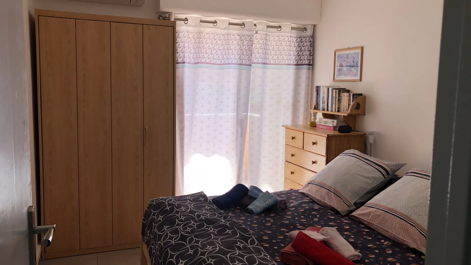 Klimatisiertes Schlafzimmer mit Fenstertür zum Balkon: Doppelbett mit allem Komfort - 2 Kopfkissen pro Person - Kleiderschrank - Kommode - Nachttisch - Bücher zur Verfügung - Radiowecker.